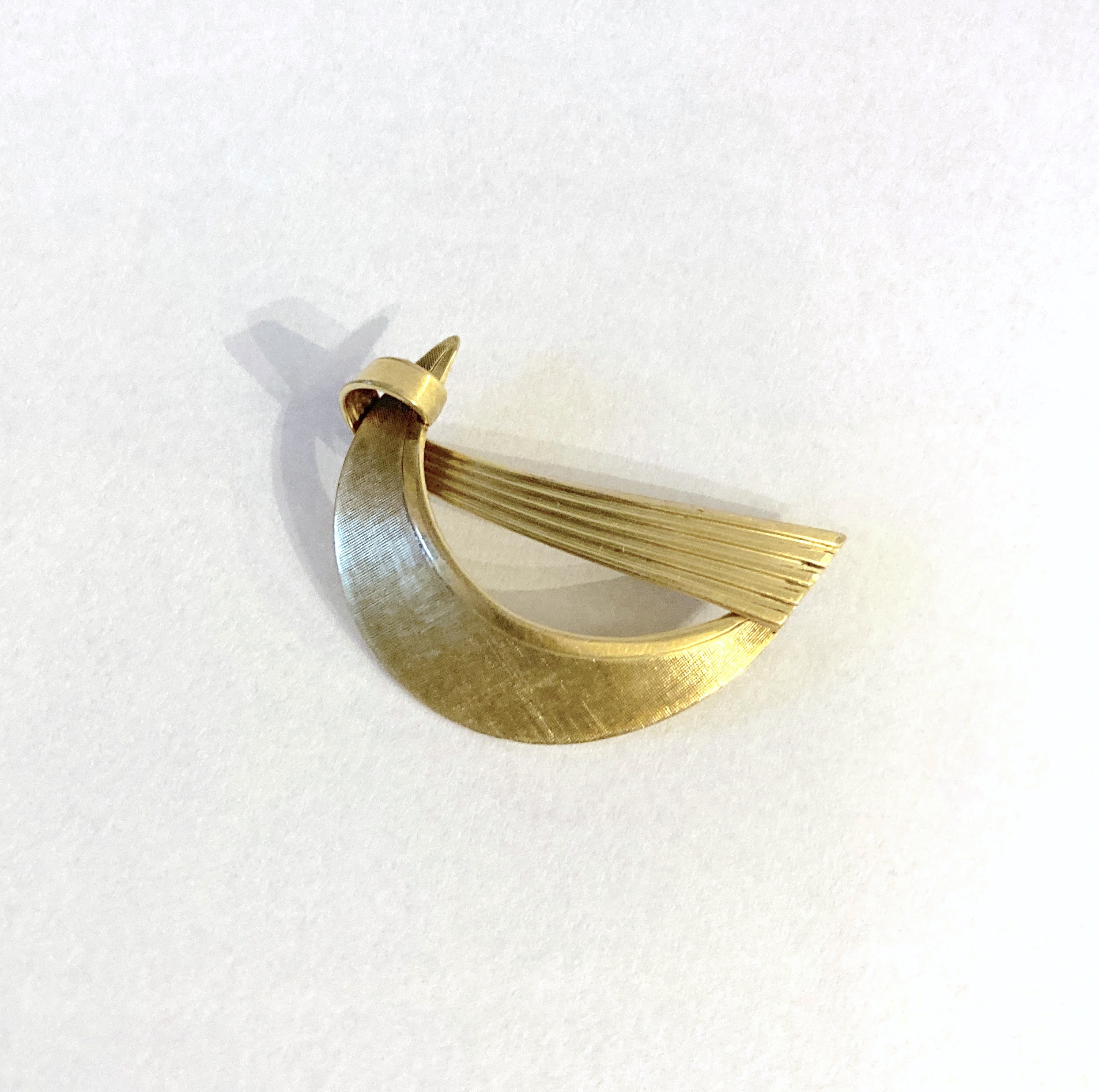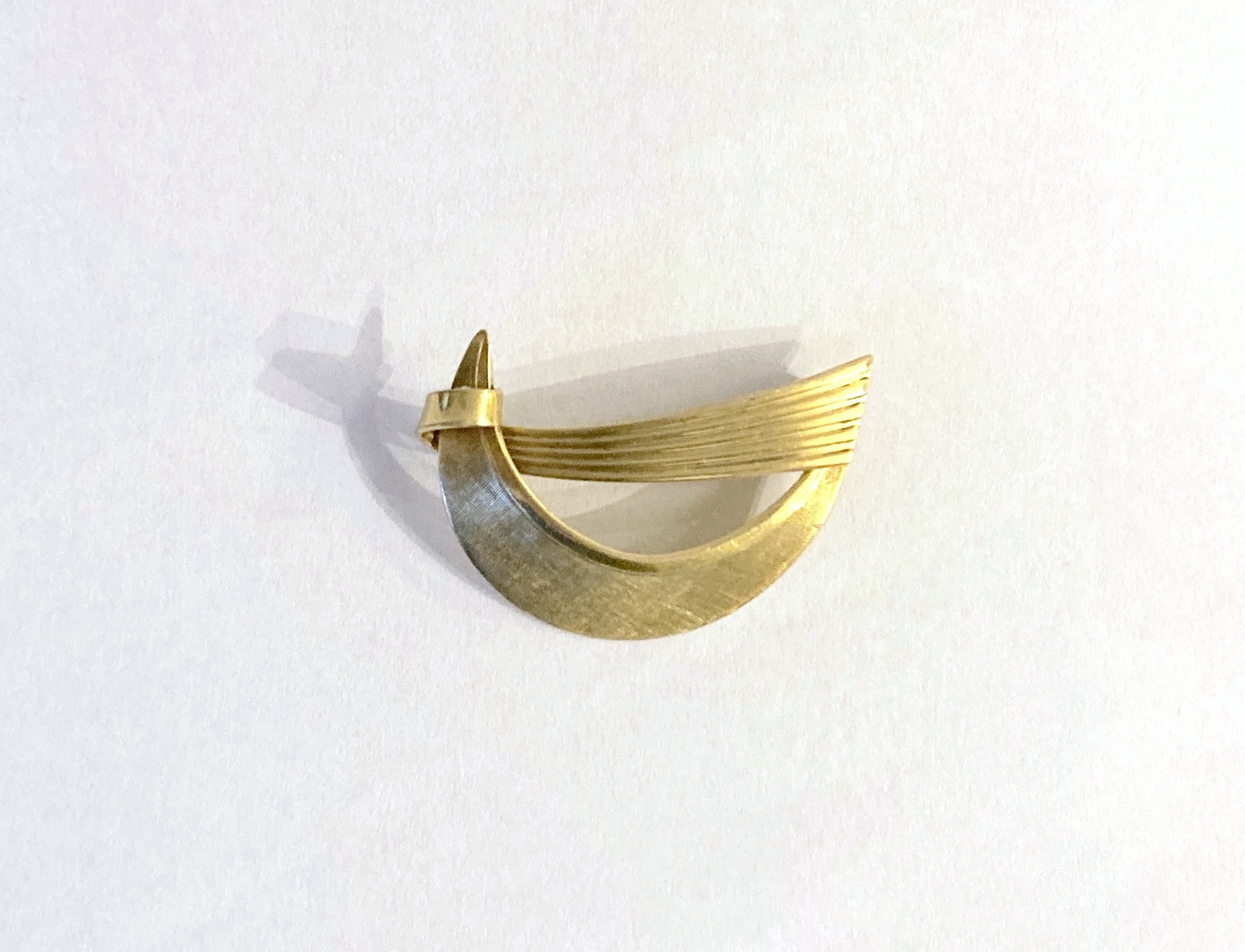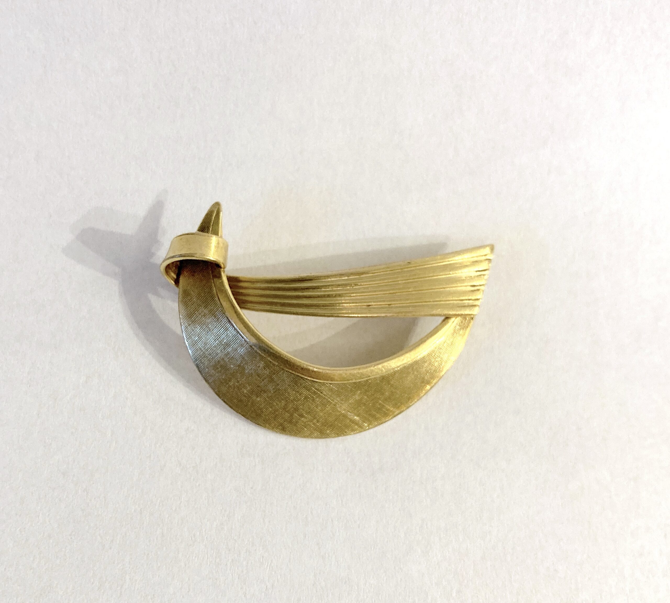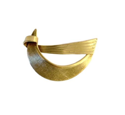 Elegancja przedmiotu opiera się na kontrastowym wykończeniu powierzchni. Szeroki, łukowaty element został poddany procesowi szczotkowania (satynowania) w drobniuteńką krateczkę, co nadaje mu szlachetny, matowy blask, podczas gdy poprzeczne żłobkowania i polerowane krawędzie wprowadzają rytm i optyczną lekkość. Tego typu biżuteria była nieodzownym elementem kobiecej garderoby epoki „Mad Men”, idealnie komponując się z klasycznymi żakietami i sukienkami o kroju litery A.