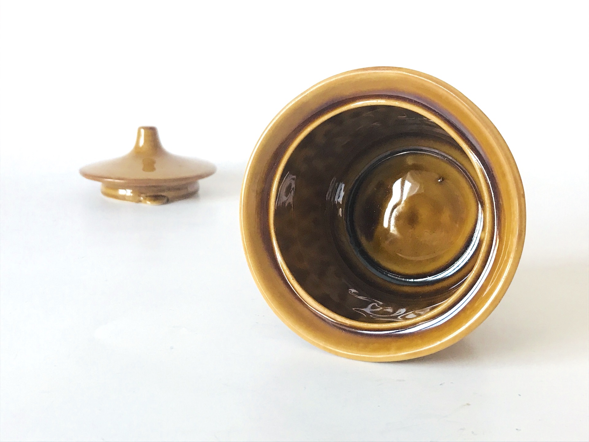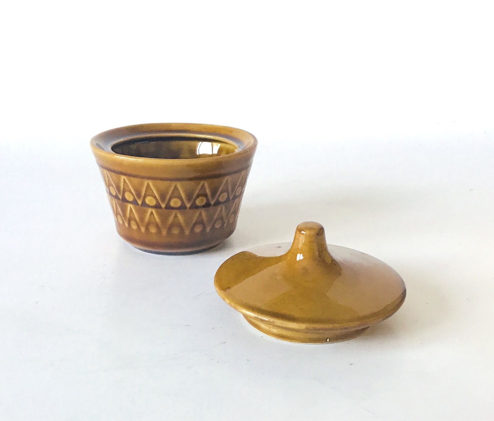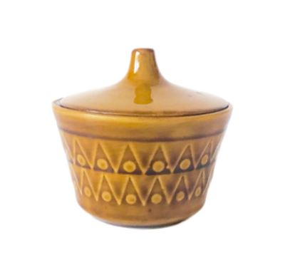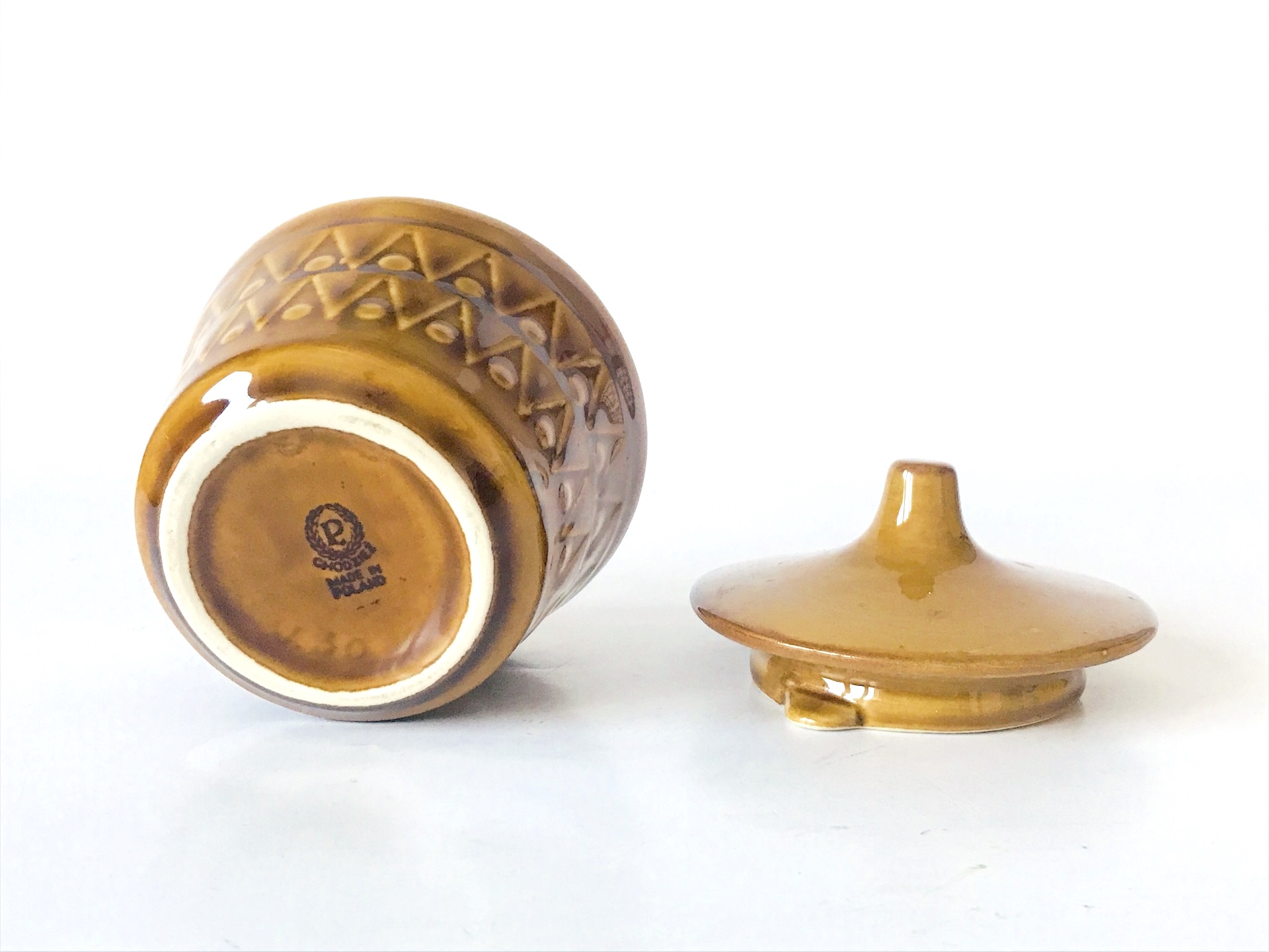 Korpus o lekko zwężającej się ku dołowi formie zdobiony jest rytmicznym, reliefowym pasem z motywem trójkątów i punktów, co nadaje całości dynamicznego charakteru. Elegancję podkreśla idealnie dopasowana, wypukła pokrywka zwieńczona smukłym, stożkowym uchwytem. To model, który w latach 60. XX wieku wyznaczał standardy nowoczesnego wyposażenia wnętrz w Polsce.