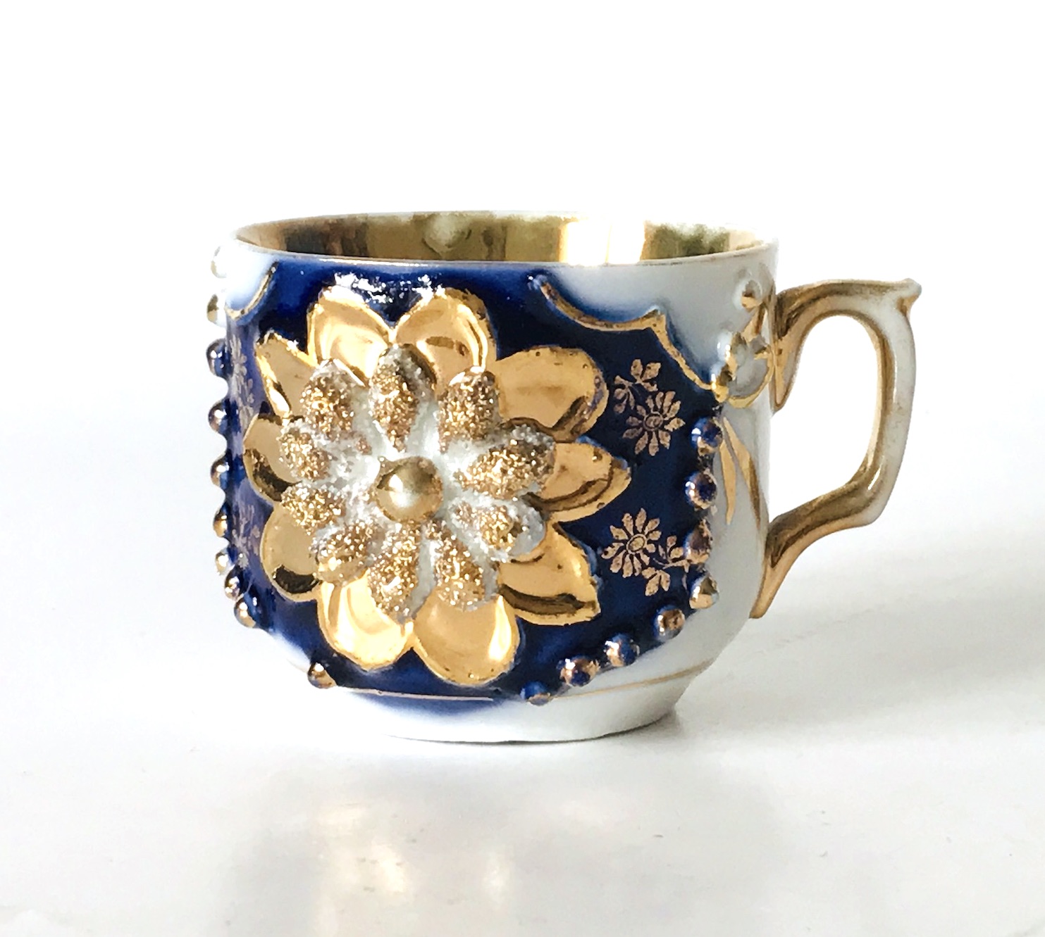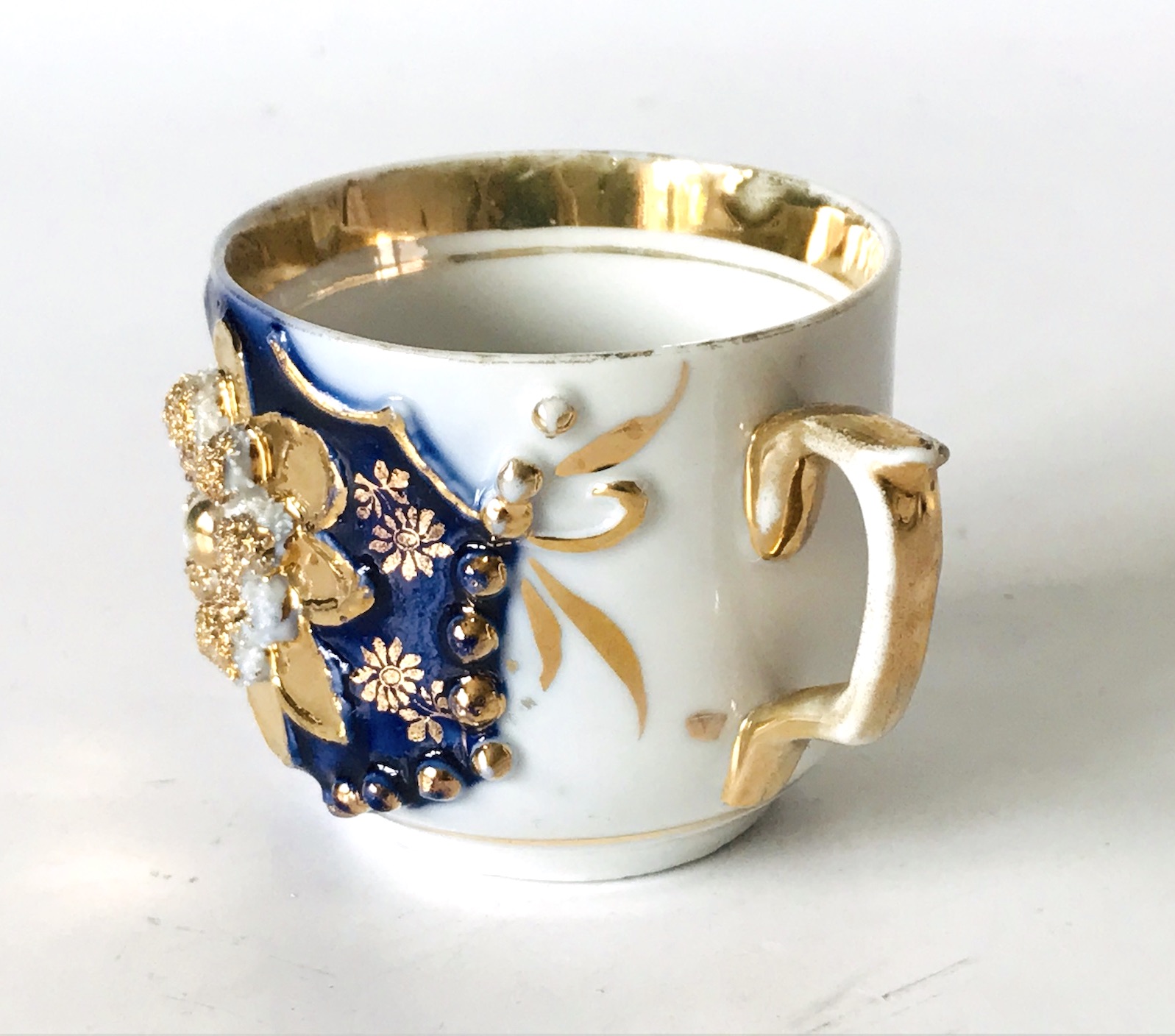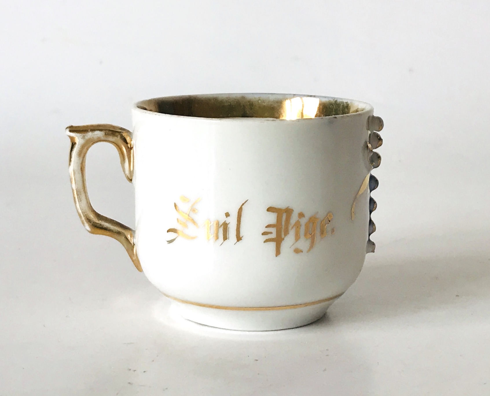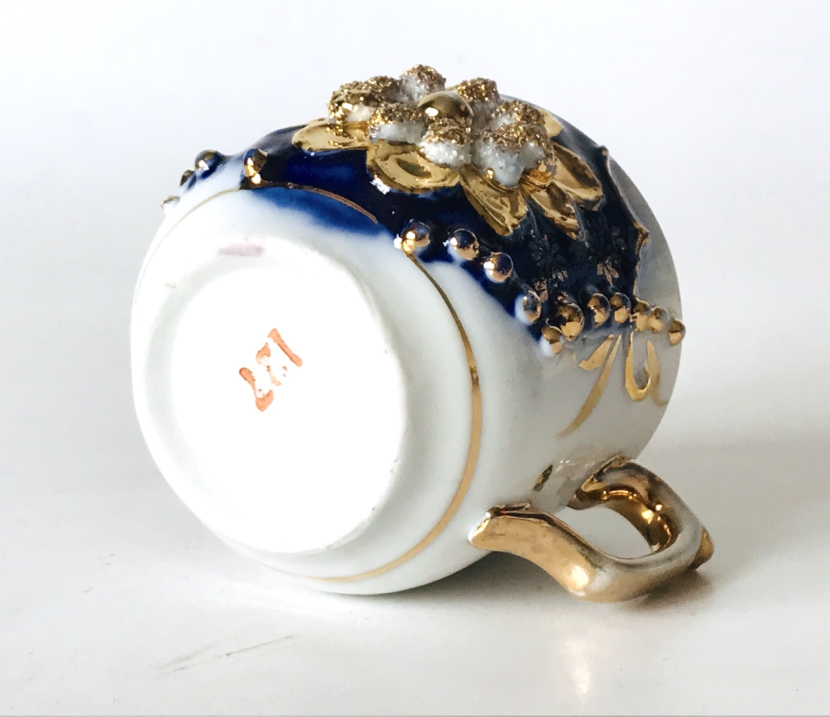 Brzeg filiżanki i ucho zostały ręcznie pozłocone, a wnętrze wykończono subtelną warstwą złota. Na spodzie widoczny jest duński napis „snill pige”, tłumaczony jako „miła dziewczynka”, co może wskazywać na sentymentalny, upominkowy charakter przedmiotu.