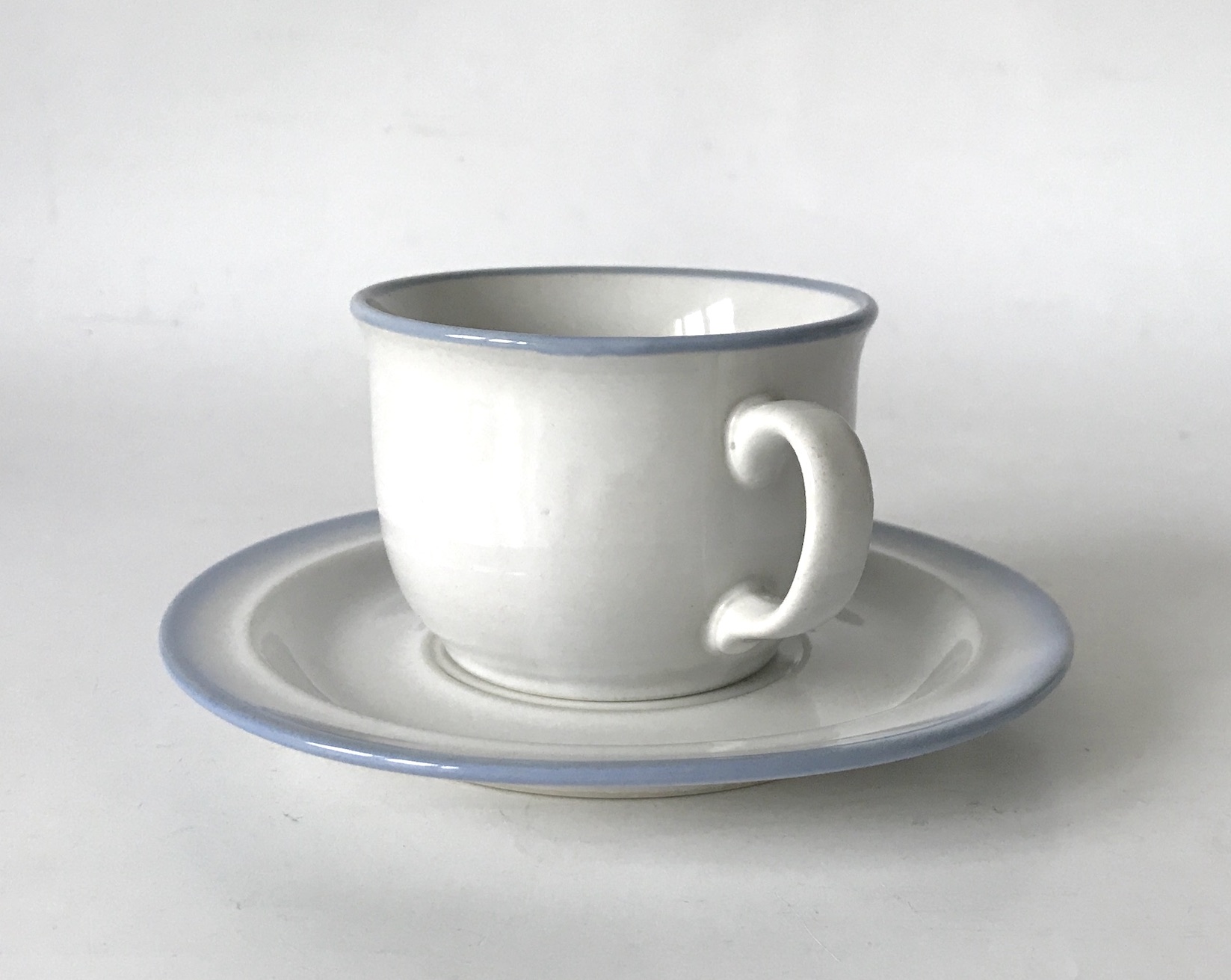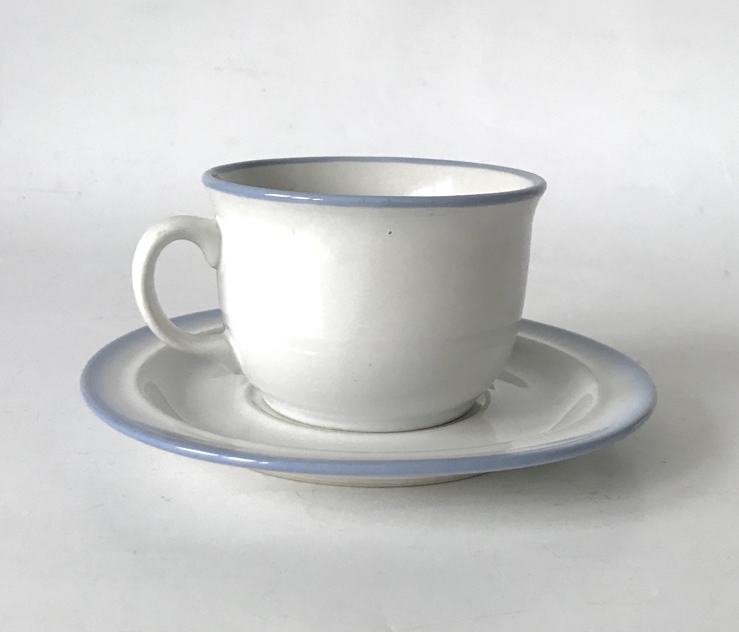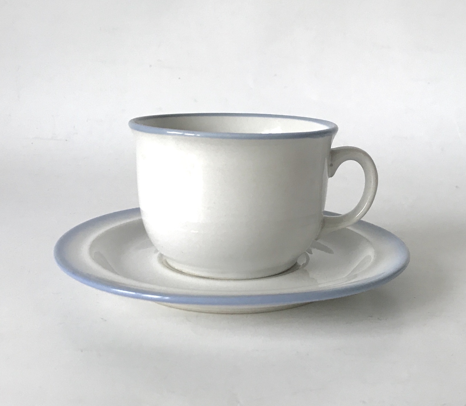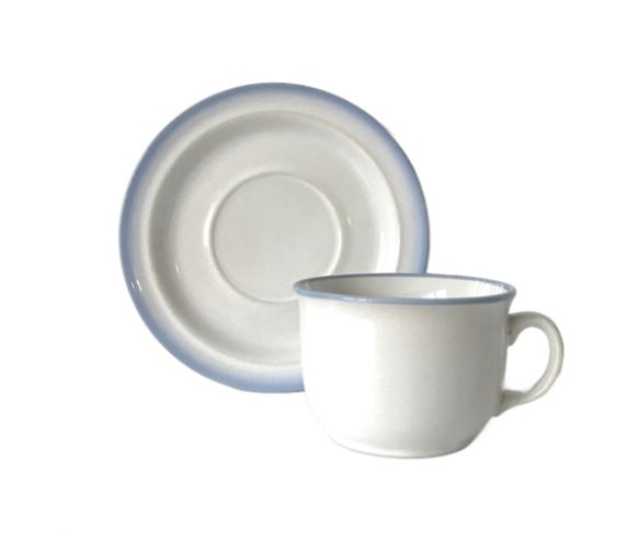 Filiżanka ze spodkiem, biała z błękitnym rantem, Pruszków