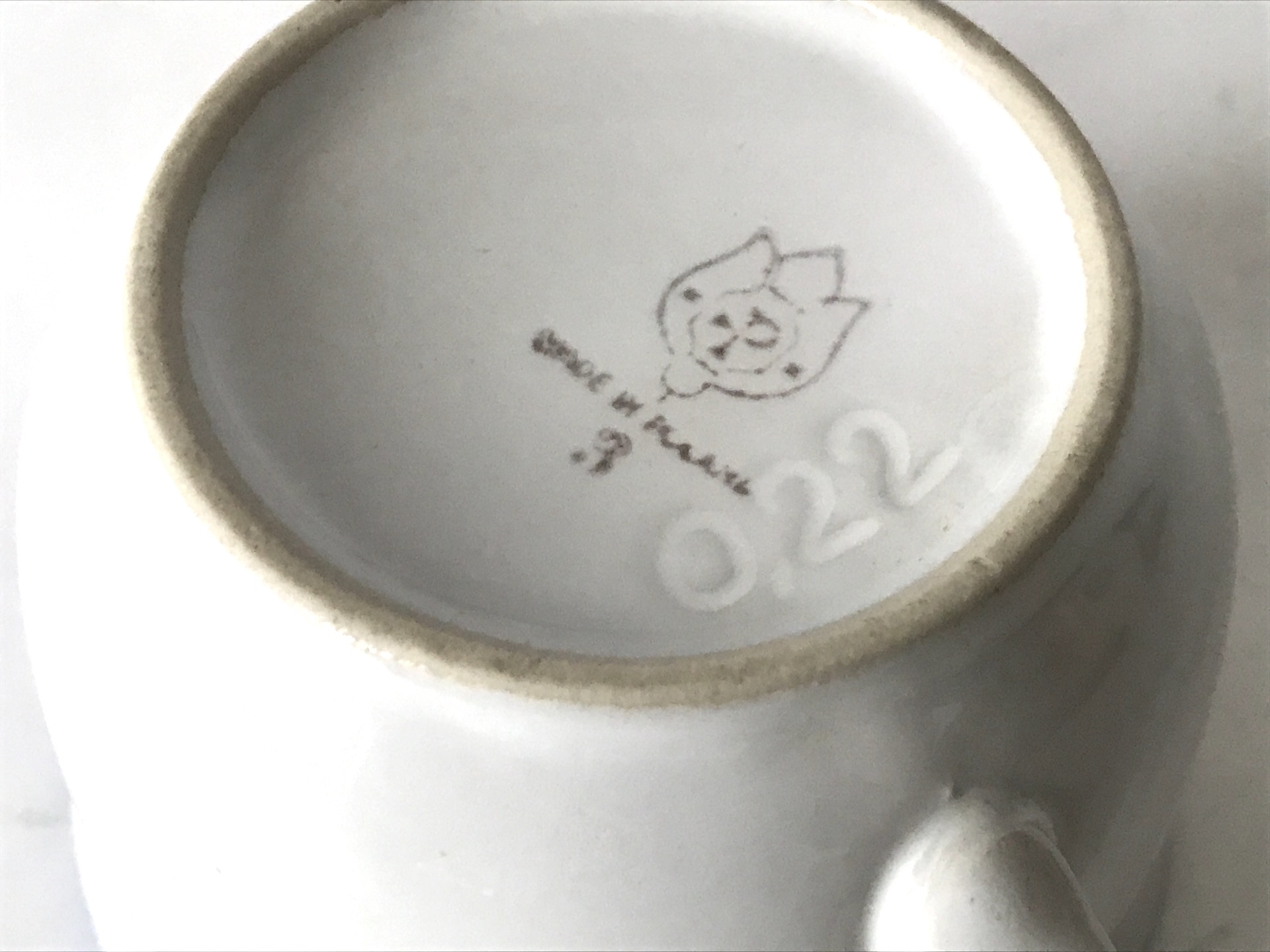 Zestaw duo, składający się z filiżanki i spodka, wyprodukowany przez Zakłady Porcelitu Stołowego „Pruszków”, co potwierdza charakterystyczna sygnatura z literą „P” wpisaną w zarys kwiatu widoczna na spodzie naczyń.