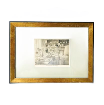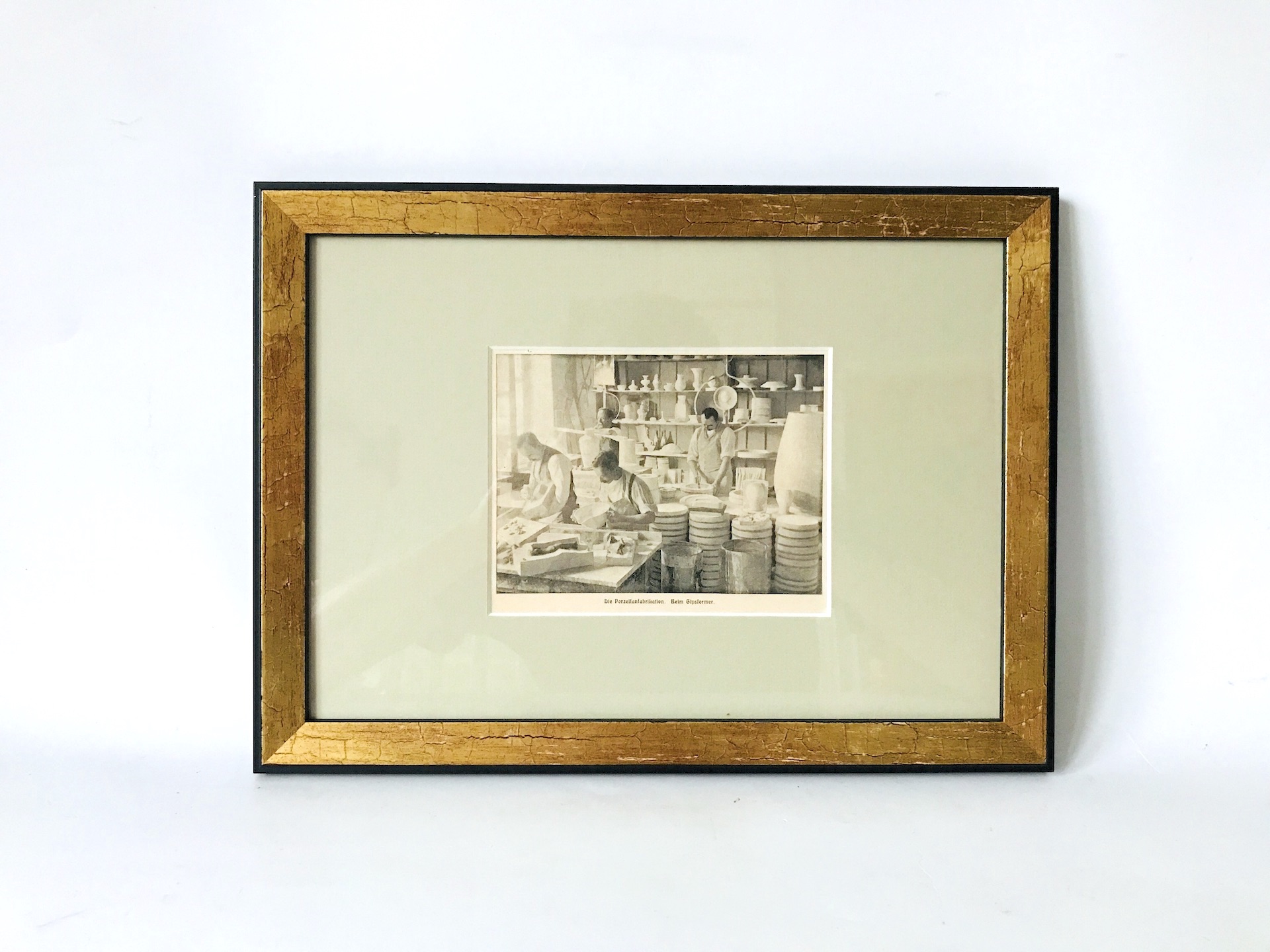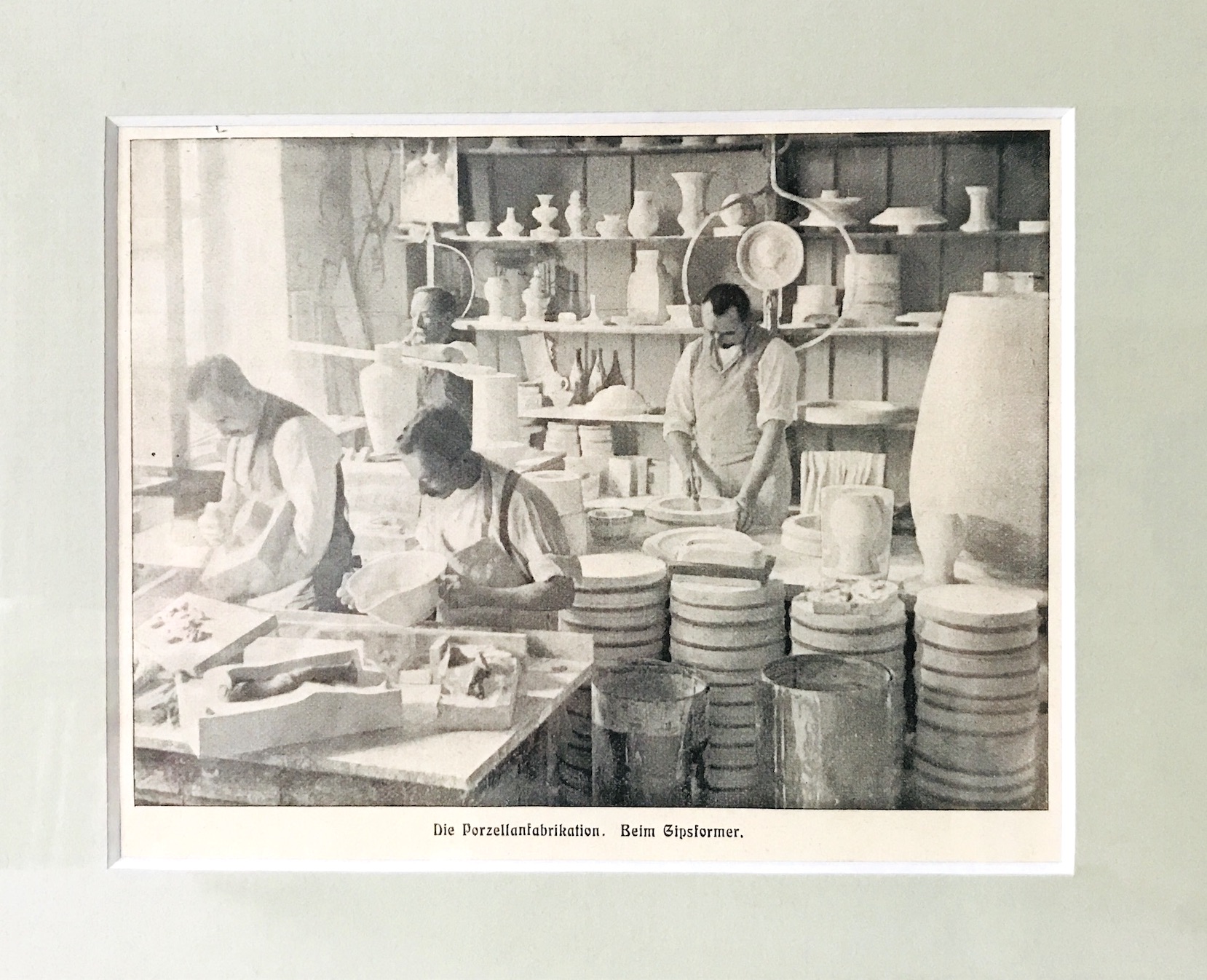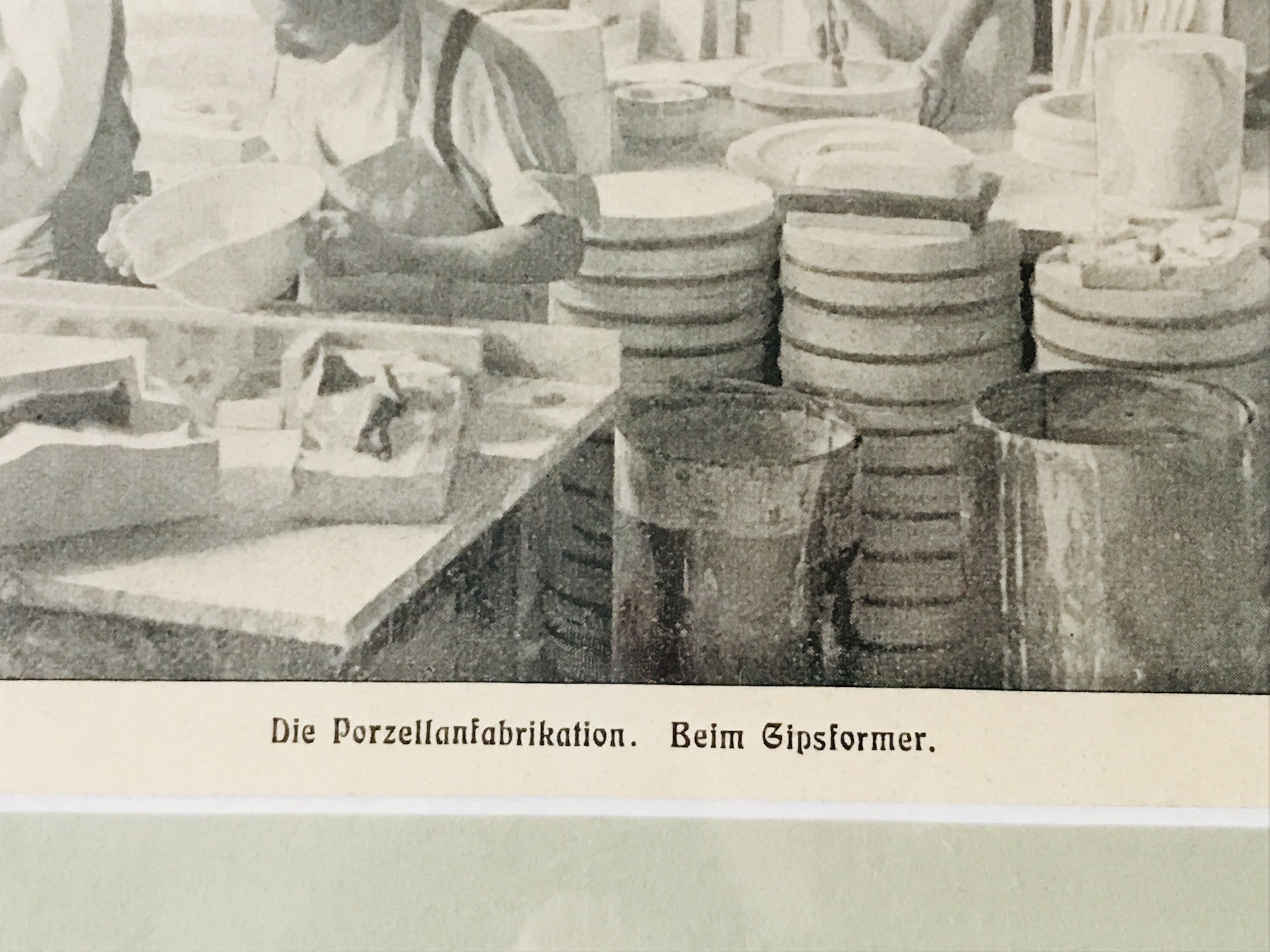 Scena ukazuje rzadko prezentowany, lecz kluczowy etap powstawania szlachetnej porcelany – pracę z formami gipsowymi. Artyzm tej techniki graficznej pozwala dostrzec skupienie rzemieślników oraz precyzję, z jaką przygotowywane są negatywy, służące do późniejszego odlewania naczyń. Widoczne na regałach gotowe formy oraz stosy matryc w pierwszym planie tworzą kompozycję pełną rytmu i warsztatowej harmonii, przenosząc widza w świat dawnych manufaktur, gdzie każdy przedmiot był dopieszczany indywidualnie przed wypałem.