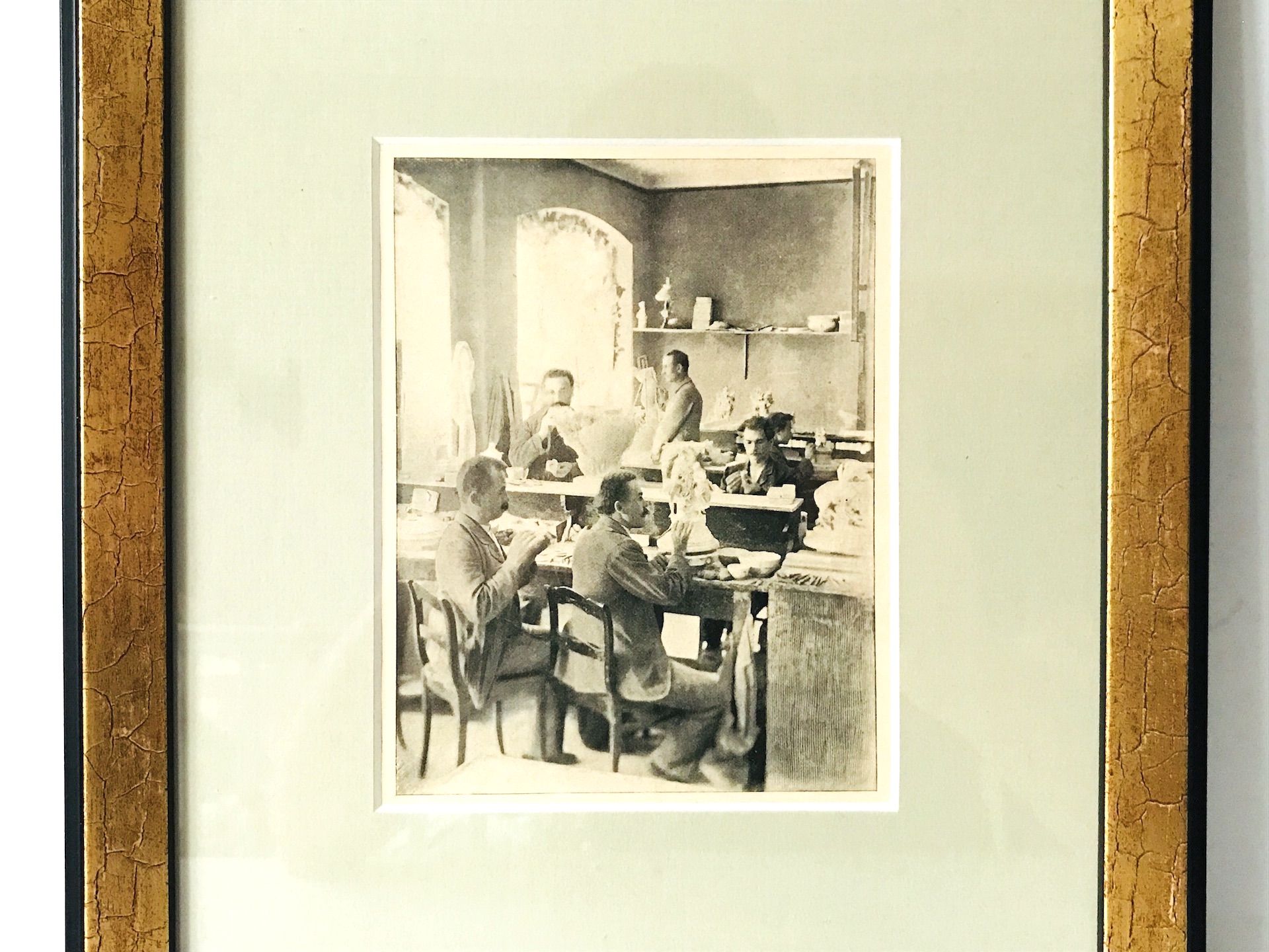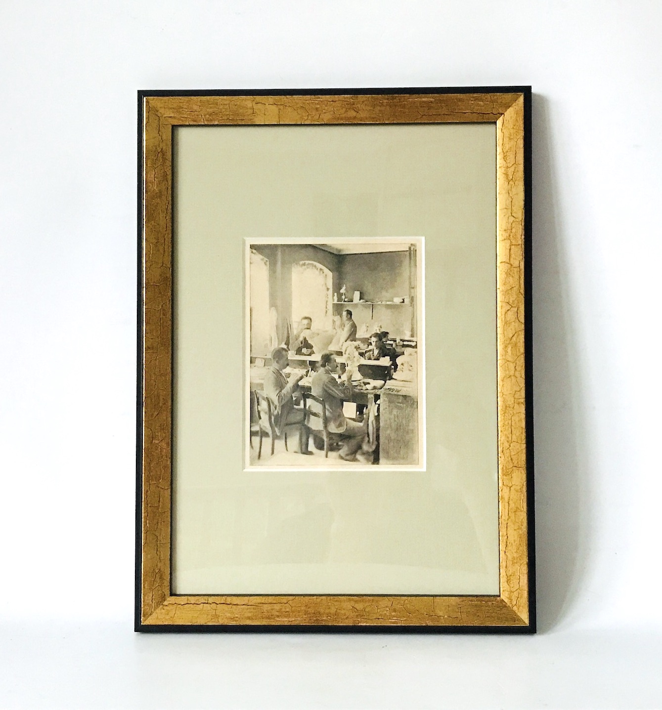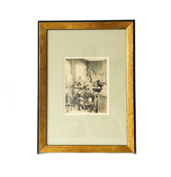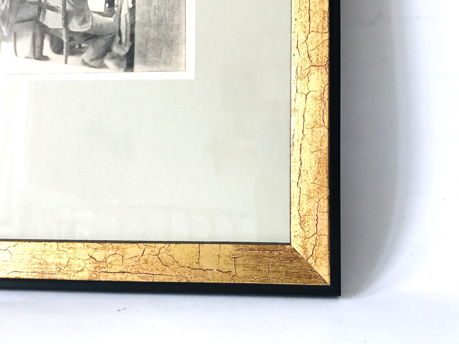 Obiekt został oprawiony w efektowną, drewnianą ramę wykończoną w technice postarzanego złota z widocznymi spękaniami (efekt craquelure), co idealnie łączy się z wiekowym charakterem ryciny. Elegancka, stonowana kolorystyka i klasyczny temat czynią z tej litografii wysmakowany dodatek do wnętrz z duszą – od tradycyjnych salonów po gabinety w stylu vintage. To unikatowy fragment historii designu, celebrujący ludzki talent i rzemieślniczą doskonałość sprzed ponad wieku.