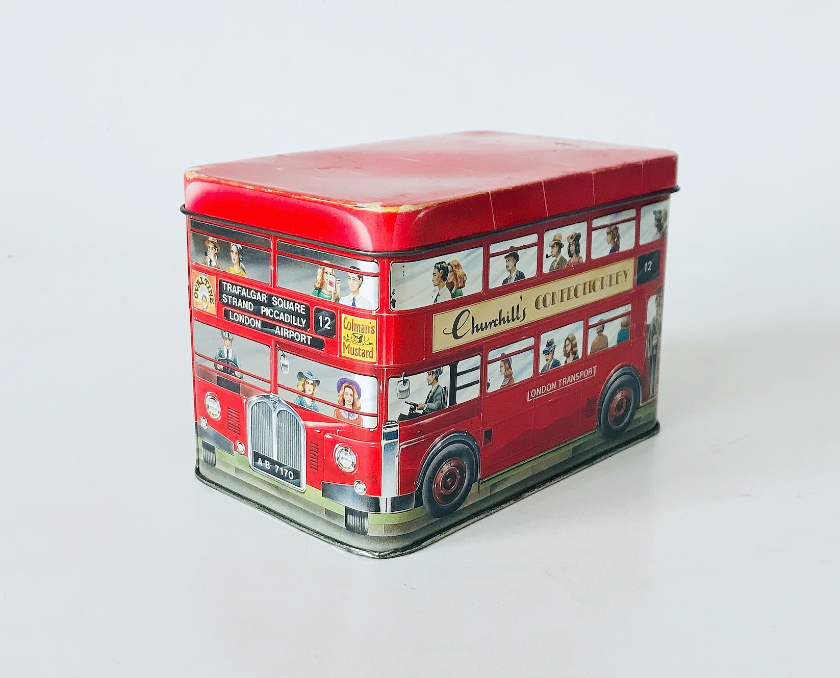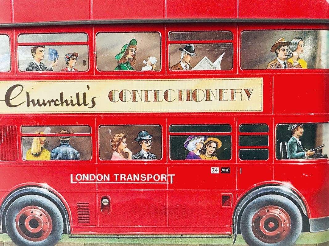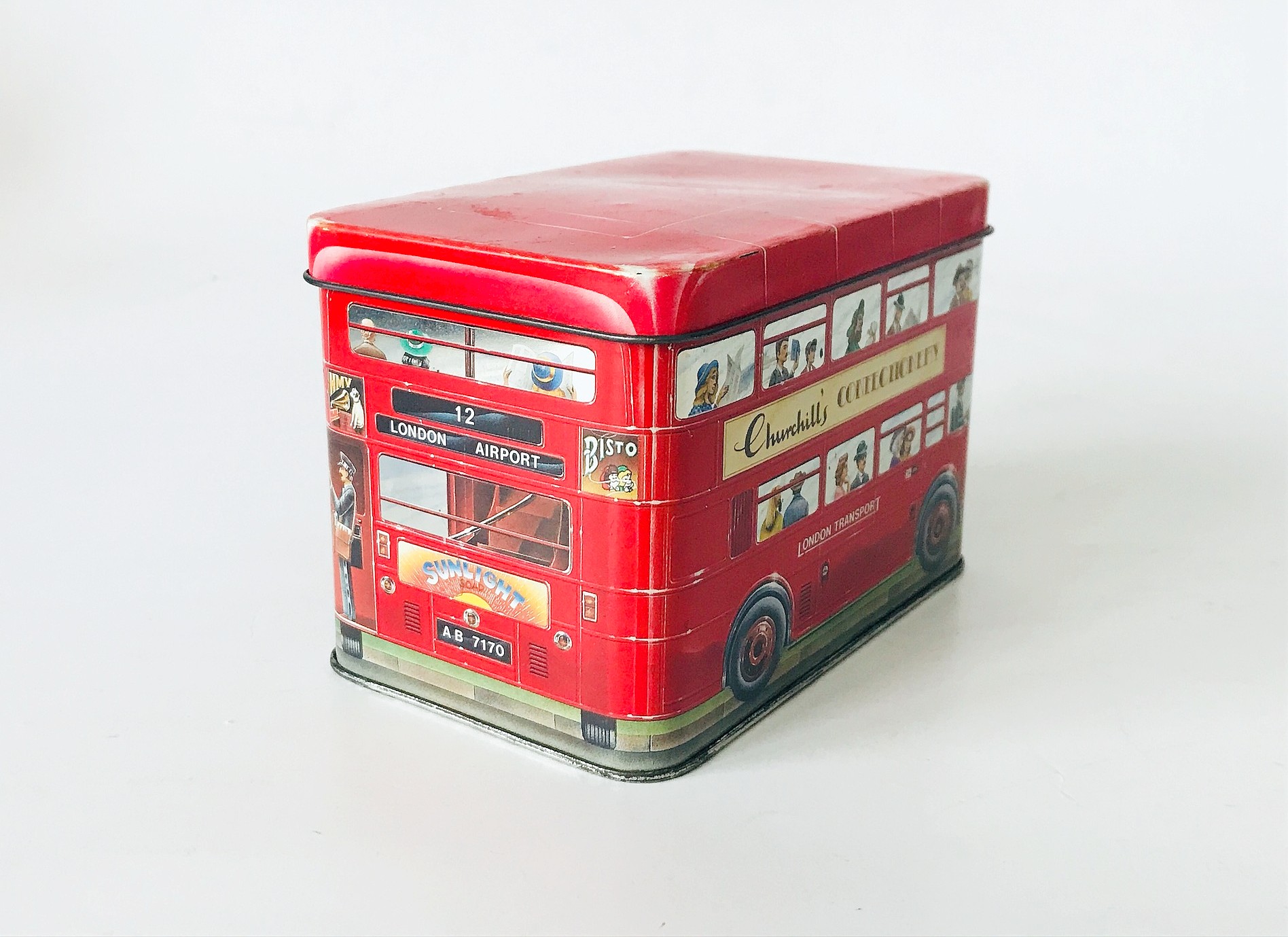 Precyzyjnie naniesiona dekoracja przedstawia pasażerów w strojach charakterystycznych dla lat 50. i 60. XX wieku, co nadaje przedmiotowi nostalgiczny, elegancki charakter. Na karoserii widnieją liczne inskrypcje oraz logotypy znanych brytyjskich marek: „Churchill’s Confectionery”, „London Transport”, „Colman’s Mustard”, „Ovaltine” oraz tablica kierunkowa: „12 TRAFALGAR SQUARE STRAND PICCADILLY LONDON AIRPORT”.