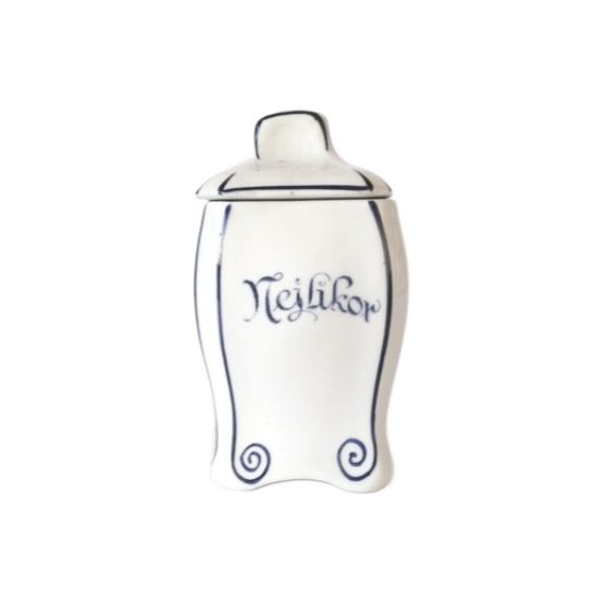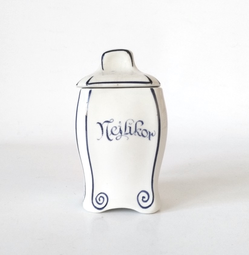Elegancki pojemnik kuchenny wykonany z fajansu delikatnego, dekorowany w niebieski wzór z antykizującymi zawijasami. Na przedniej ściance ozdobny napis: Nejlikor, czyli goździki. Obiekt pochodzi ze szwedzkiej wytwórni w Gävle (dawniej Gefle). Pojemnik sygnowany na spodzie znakiem producenta.