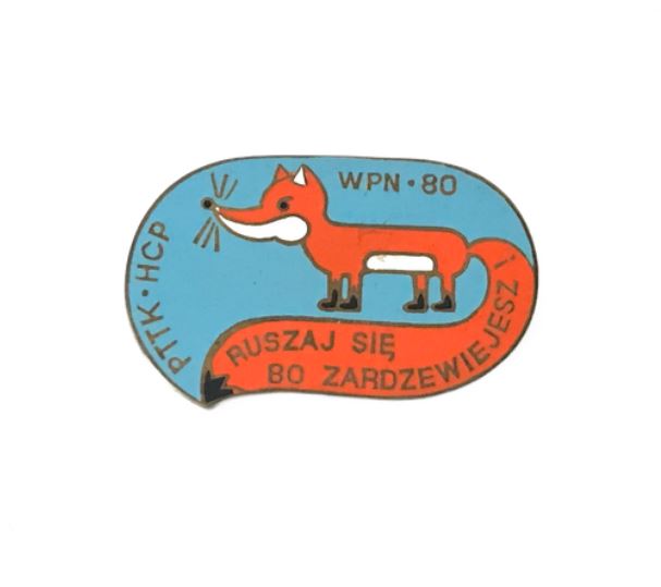 Stylizowana, pomarańczowa sylwetka lisa z długim ogonem na błękitnym tle. Postać lisa jest narysowana w sposób uproszczony, typowy dla polskiej grafiki użytkowej tamtych lat. Na ogonie lisa widnieje napis: „RUSZAJ SIĘ BO ZARDZEWIEJESZ!”. To popularne w tamtym czasie hasło propagujące aktywność fizyczną i zdrowy tryb życia.