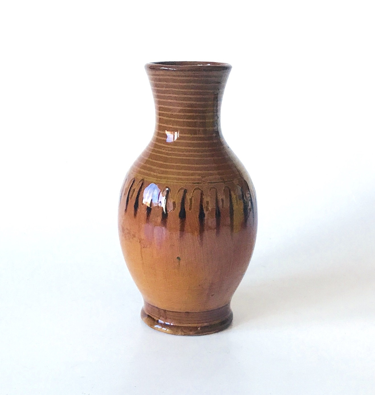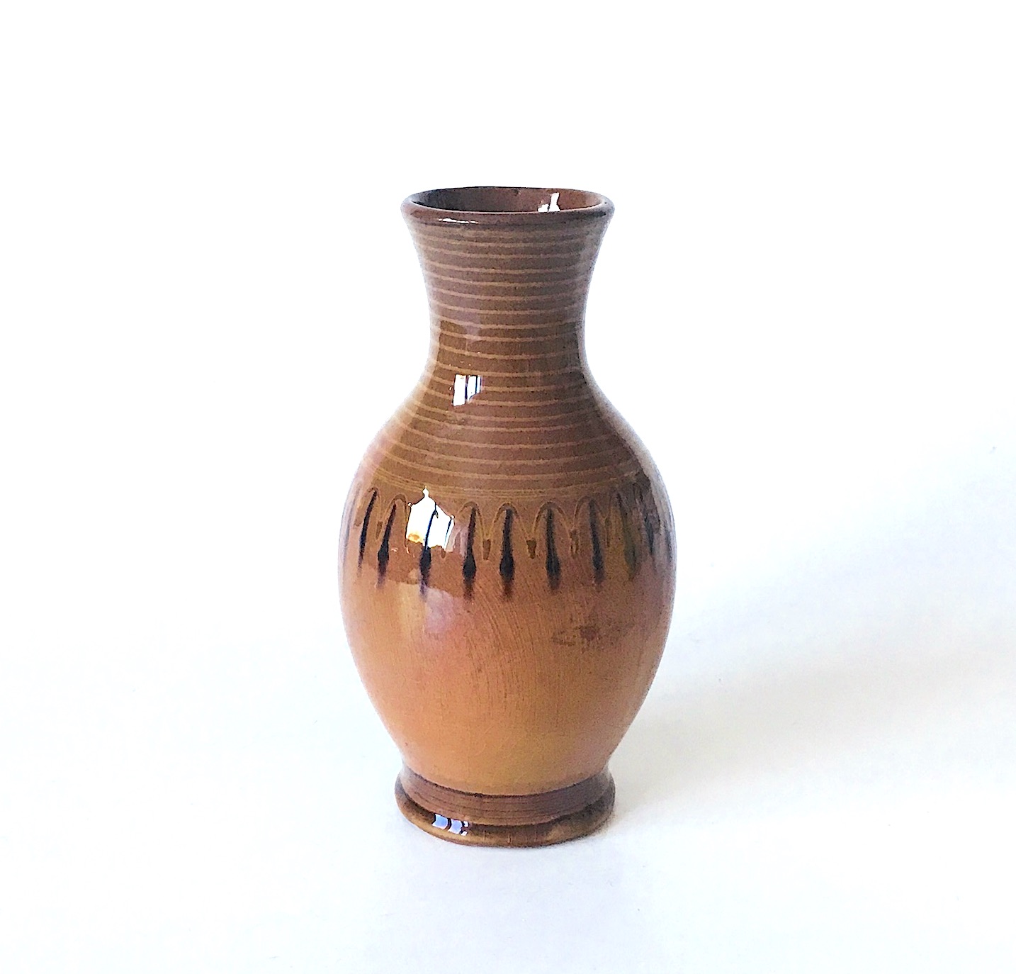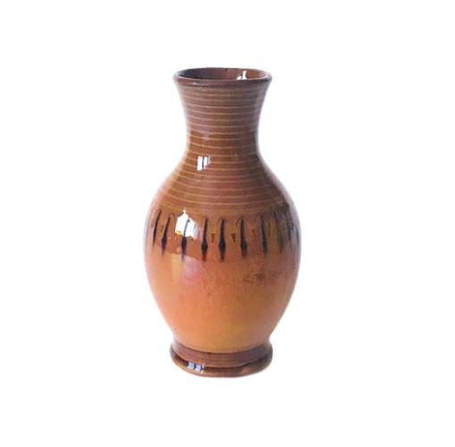 Obiekt reprezentuje stylistykę modernistycznego rzemiosła artystycznego połowy XX wieku, łącząc w sobie surowość materiału z elegancją formy. Sposób wykończenia oraz kolorystyka nawiązują do najlepszych tradycji europejskiej ceramiki użytkowej z lat 50. i 60. XX wieku. Wysoki połysk szkliwa podkreśla głębię barw i chroni naczynie, czyniąc je zarówno efektownym elementem dekoracyjnym, jak i w pełni funkcjonalnym przedmiotem codziennego użytku. Wazon w stylu tych, które były wytwarzane w kultowej Łysej Górze w epoce PRL-u.