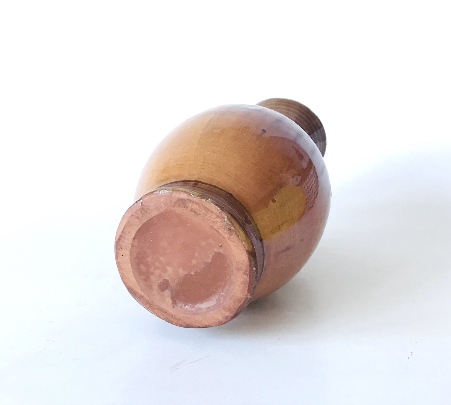 Stan zachowania wazonu jest bardzo dobry, z widoczną na spodzie naturalną strukturą nieszkliwionej masy ceramicznej w kolorze ceglastym. To doskonały przykład wzornictwa, które mimo upływu lat zachowuje swoją aktualność i elegancję w nowoczesnych wnętrzach.