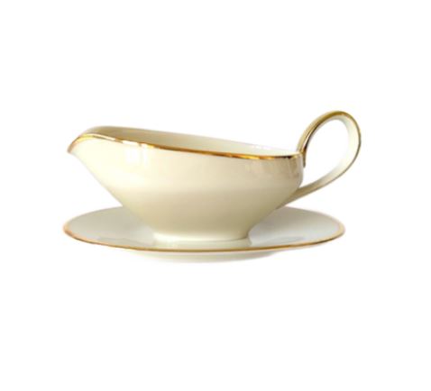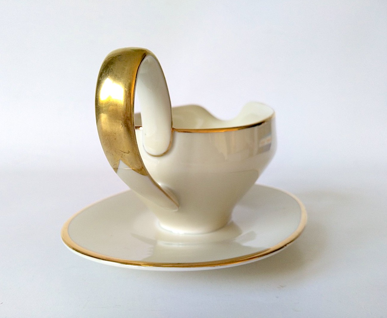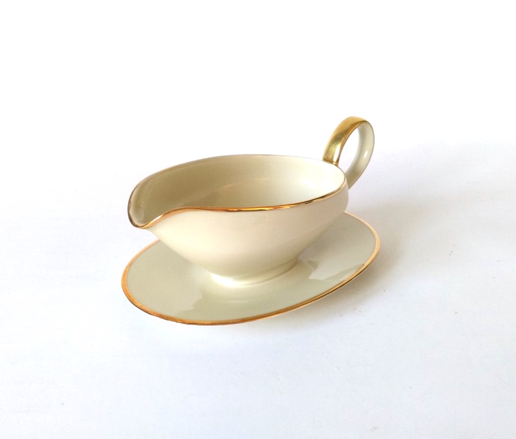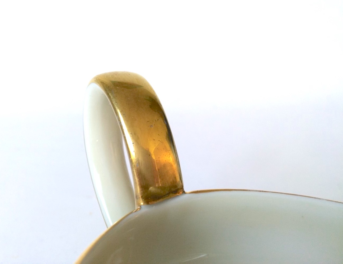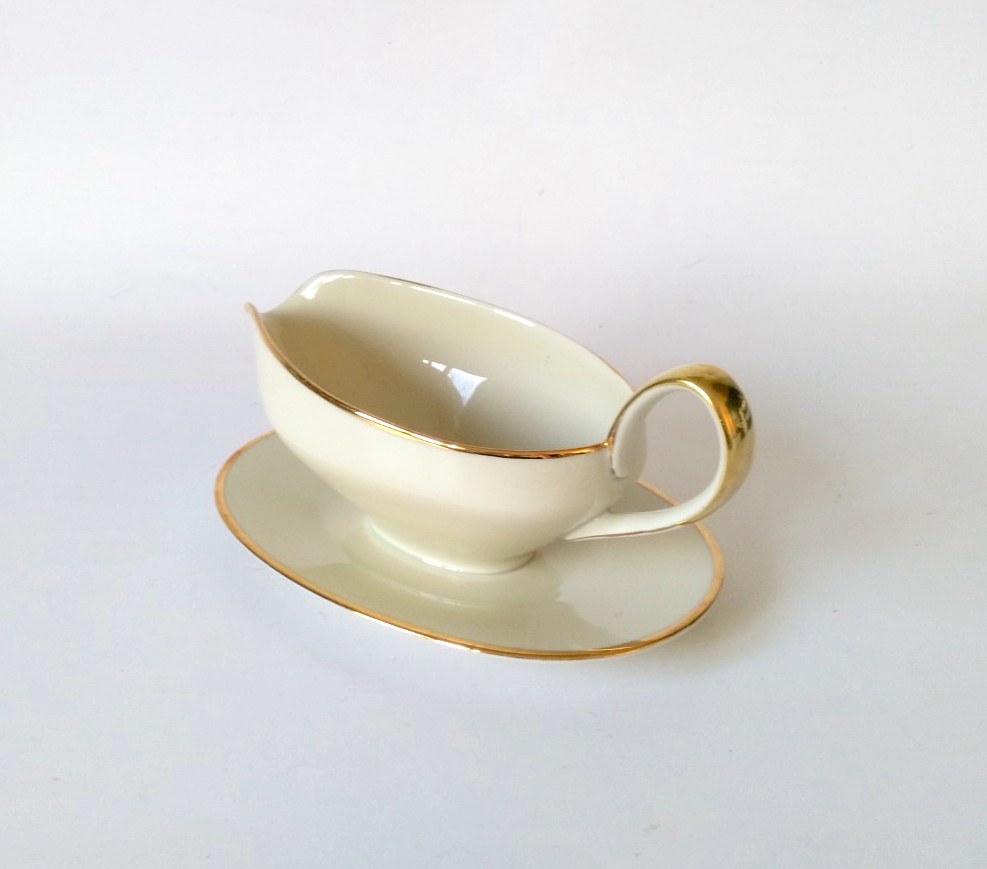 Naczynie o klasycznych opływowych kształtach, posadowione na stabilnym podłużnym spodeczku, jednak z pewną nutką nowoczesnej nonszalancji w fasonie – zwłaszcza w odważnym poprowadzeniu dzióbka. Z tak poprowadzoną formą pięknie harmonizuje wybawienie w kremowych odcieniach kości słoniowej. Krawędzie naczynia obwiedziono eleganckim złoceniem.