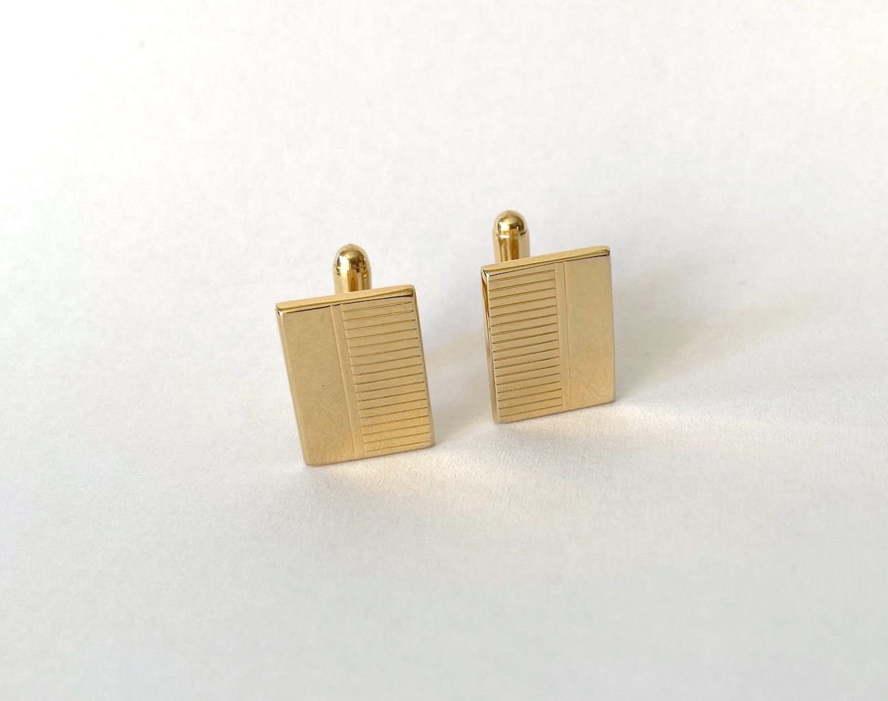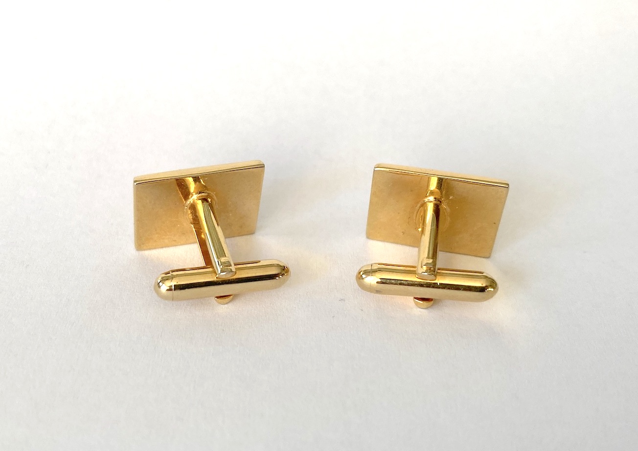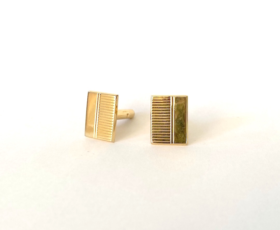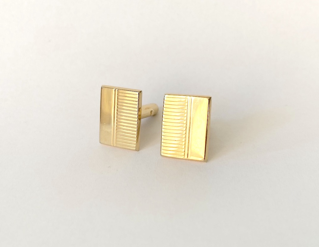 Spinki reprezentują nurt ponadczasowej elegancji. Dzięki połączeniu gładkiej powierzchni z teksturą, pasują zarówno do formalnych garniturów wieczorowych, jak i do zestawów biznesowych. Złota kolorystyka najlepiej komponuje się z białą lub błękitną koszulą oraz dodatkami w podobnym odcieniu (zegarek, sprzączka paska).
