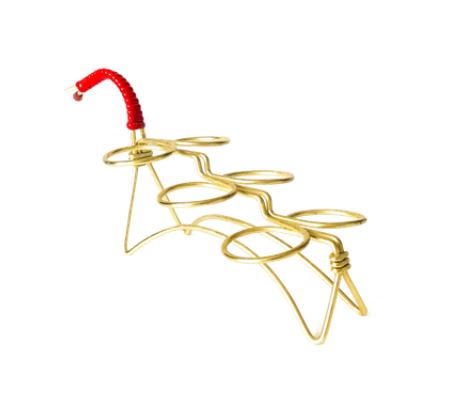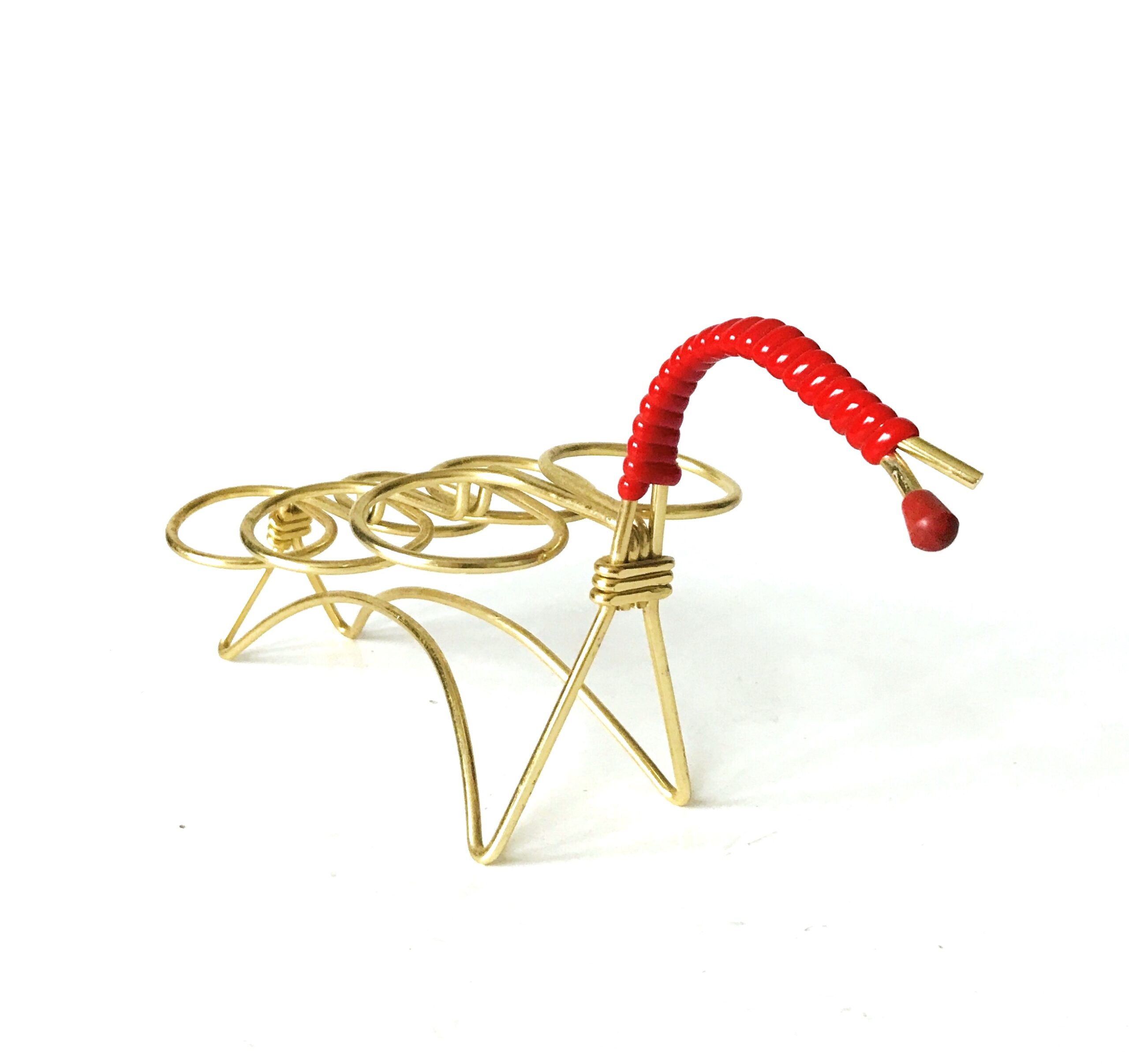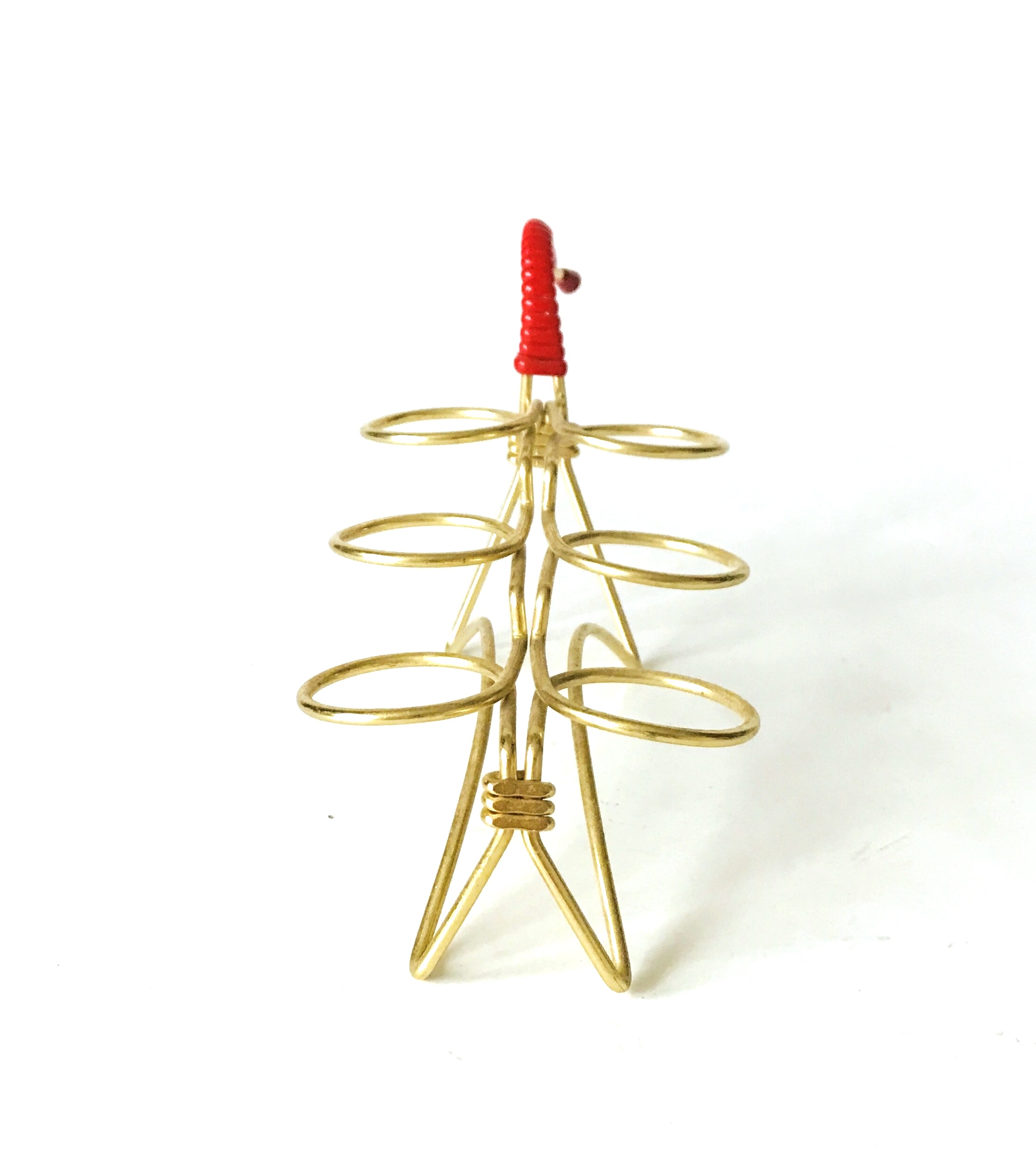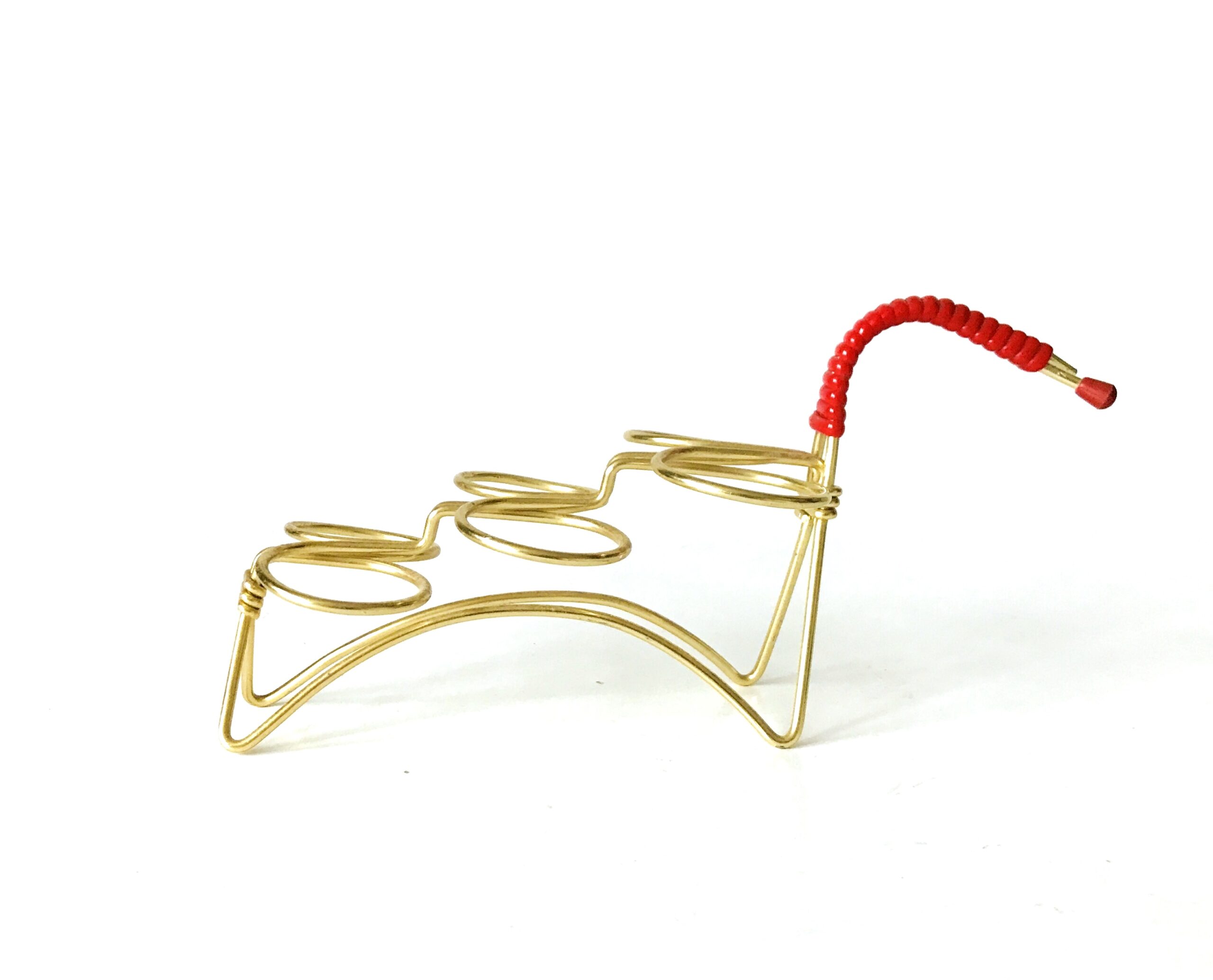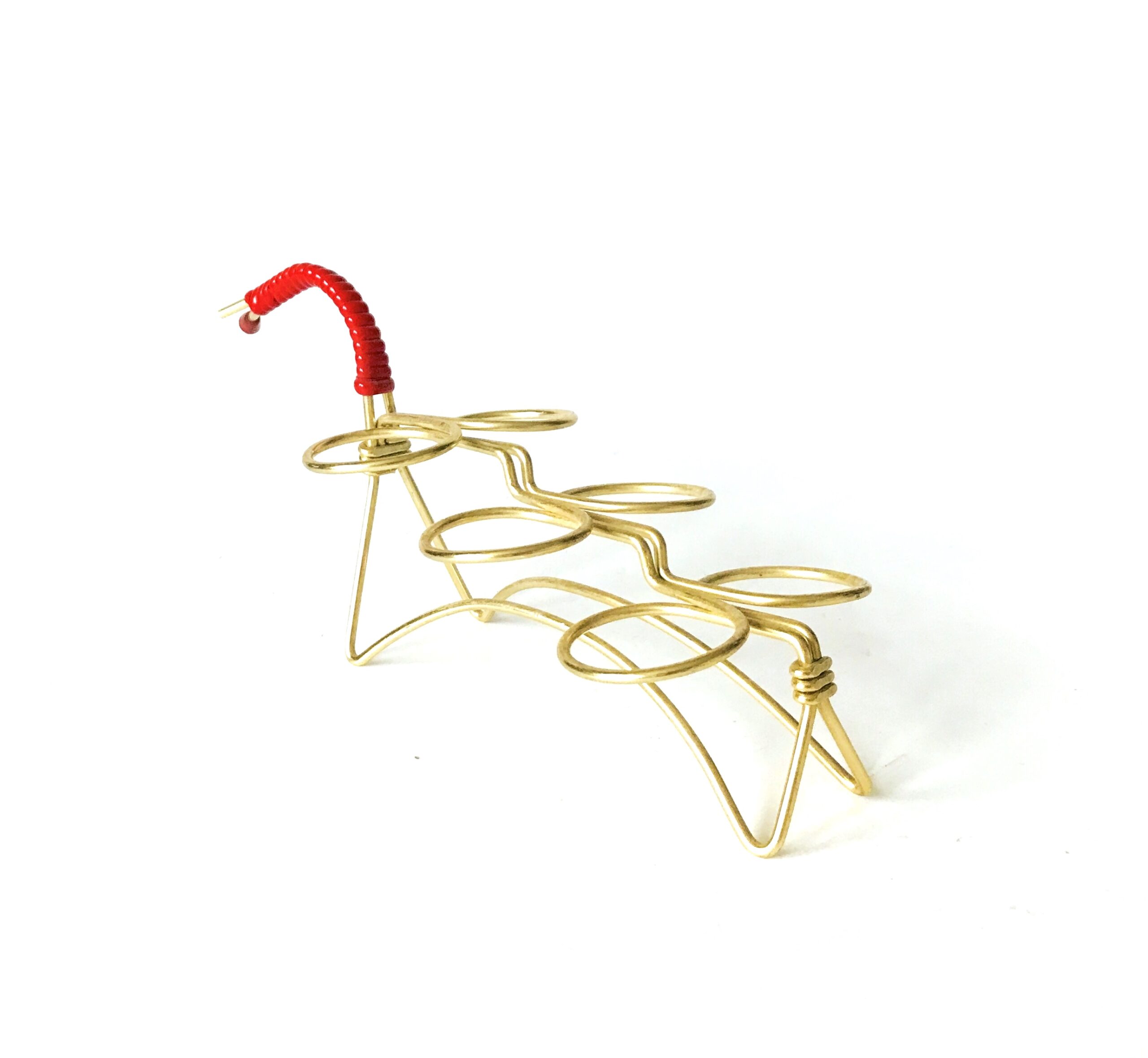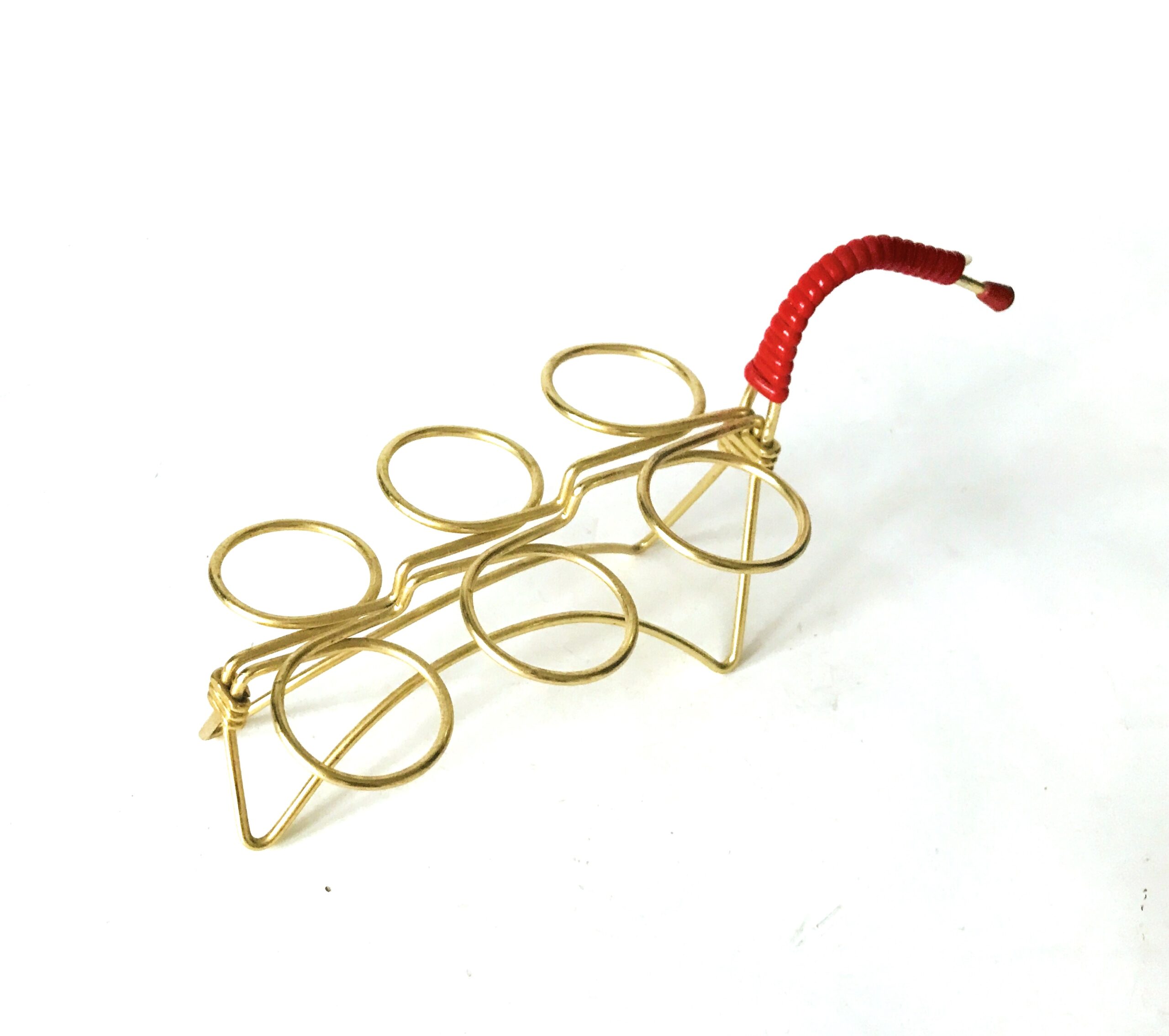 Charakterystyczny uchwyt do przenoszenia stanowi mocny akcent wizualny. Wykonany z intensywnie czerwonego, plecionego sznura, kontrastuje on z błyszczącym metalem. To zestawienie kolorystyczne (złoto i czerwień) jest typowe dla klasycznego stylu lat 50. i 60. XX wieku, dodając stojakowi niepowtarzalnego, vintage’owego uroku. Brak jednego z czerwonych zakończeń uchwytu.