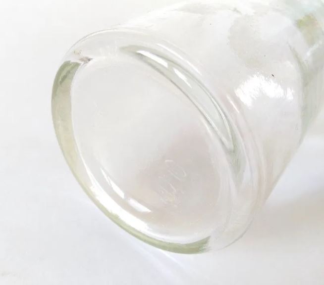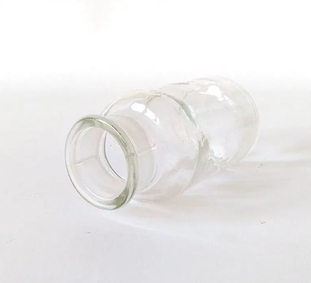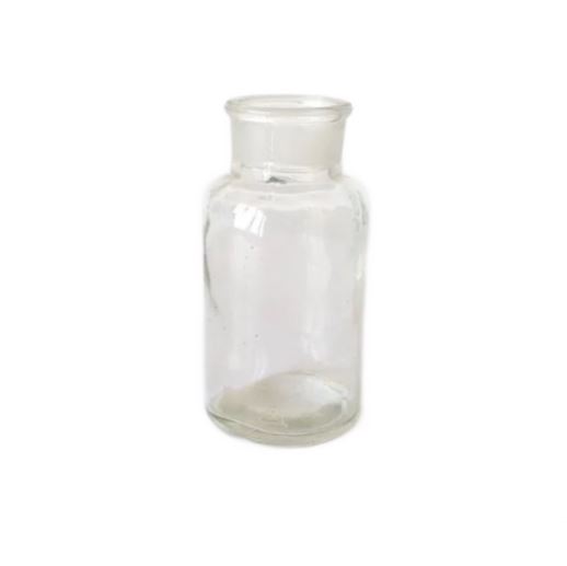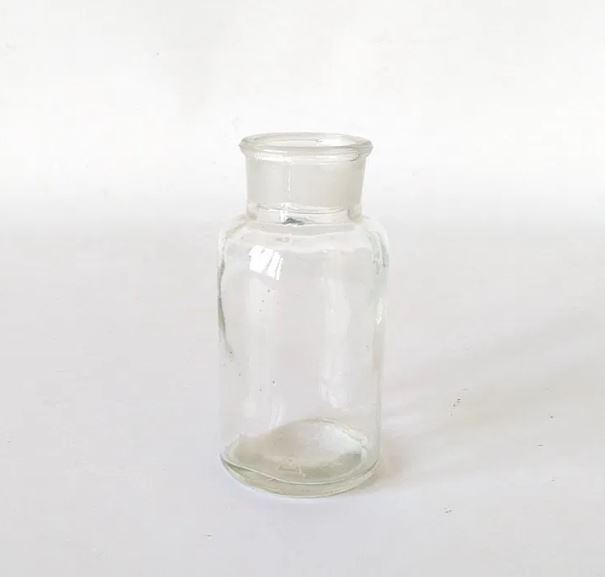 Stary, laboratoryjny flakon wykonany z grubego, lekko nieregularnego szkła, które nadaje mu unikatowy, autentyczny charakter. Doskonale sprawdzi się jako niewielki wazon na drobne kwiaty, gałązki lub trawy, pięknie wpisując się w surowe, minimalistyczne i industrialne wnętrza.