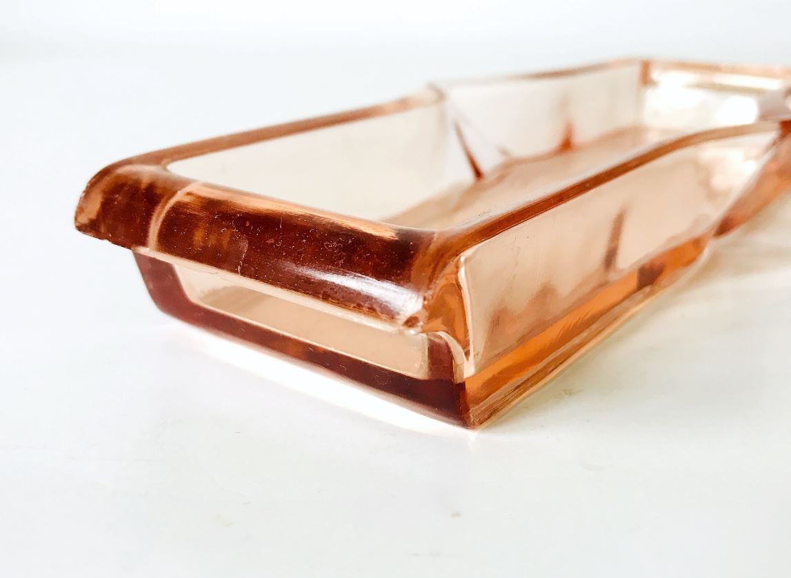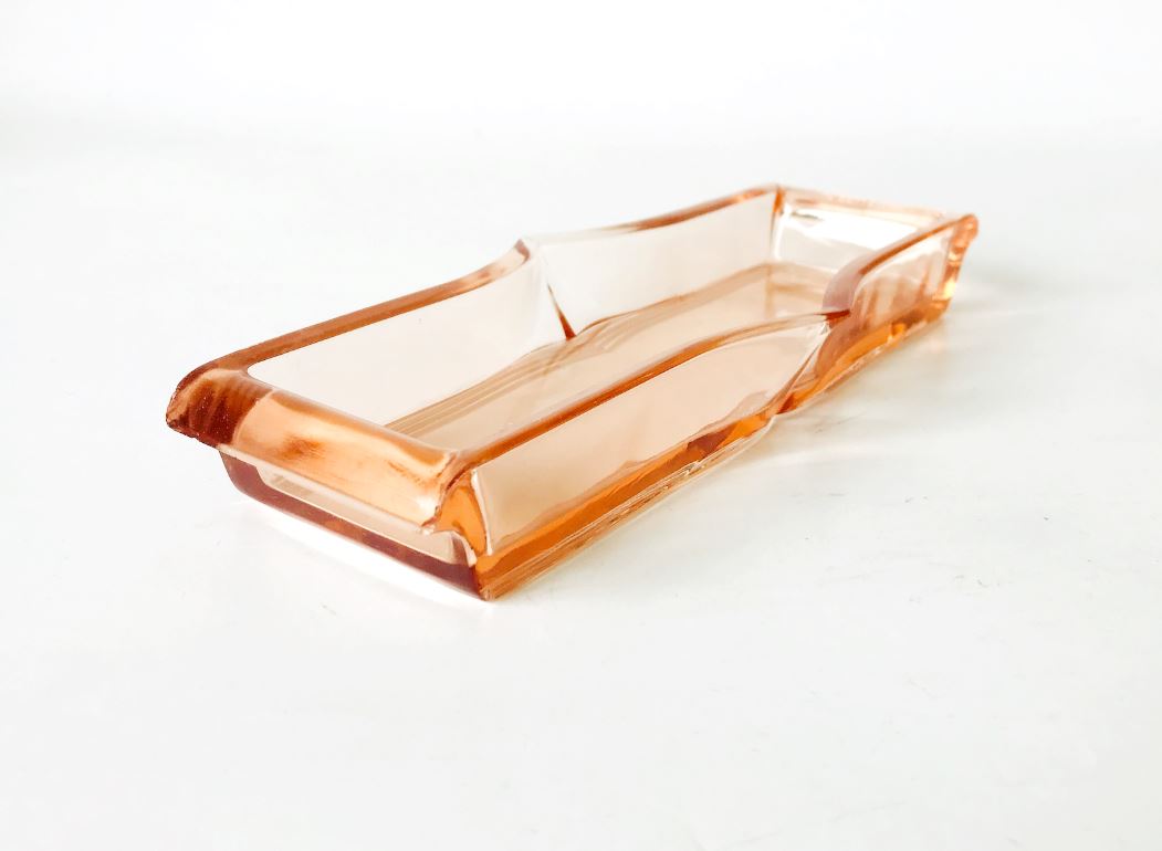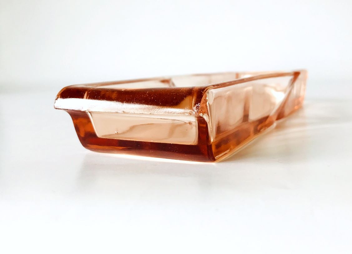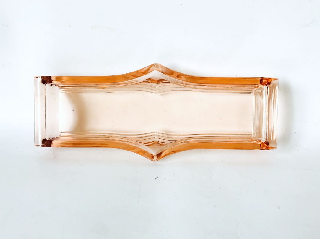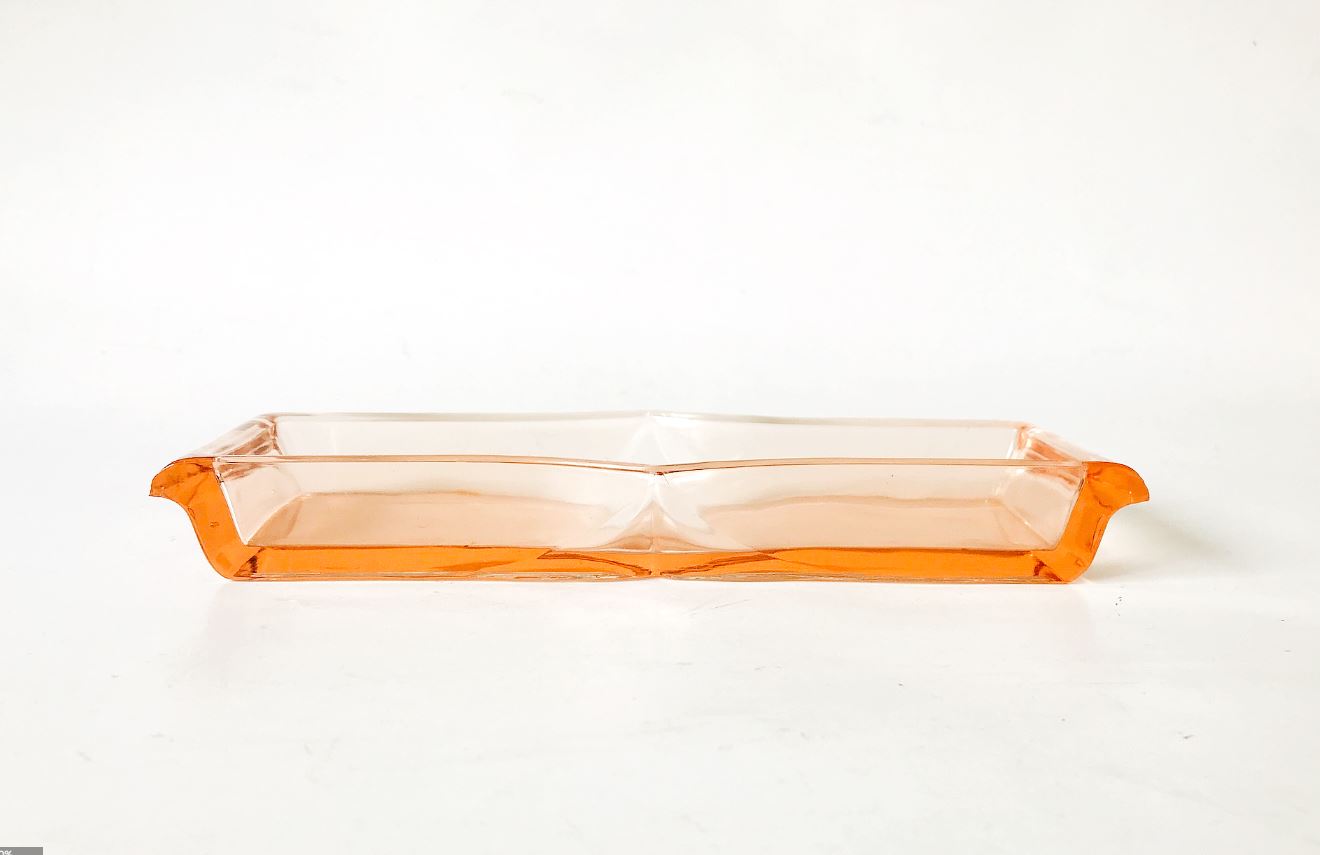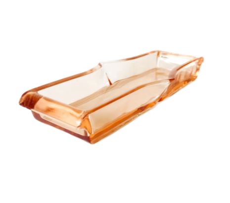 Ta elegancka taca toaletowa jest świadectwem dbałości o detale w sztuce użytkowej dwudziestolecia międzywojennego. Poziome, fasetowane wykończenia oraz transparentny, ciepły kolor doskonale oddają ducha luksusowego wyposażenia toaletki lub sypialni. Tego typu przedmioty służyły do przechowywania biżuterii, perfum lub innych drobiazgów.