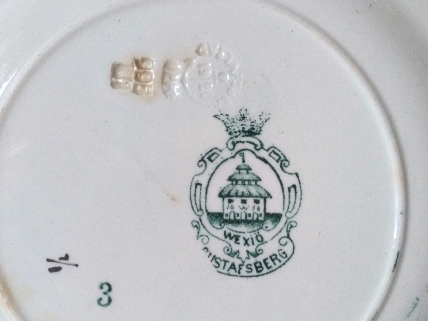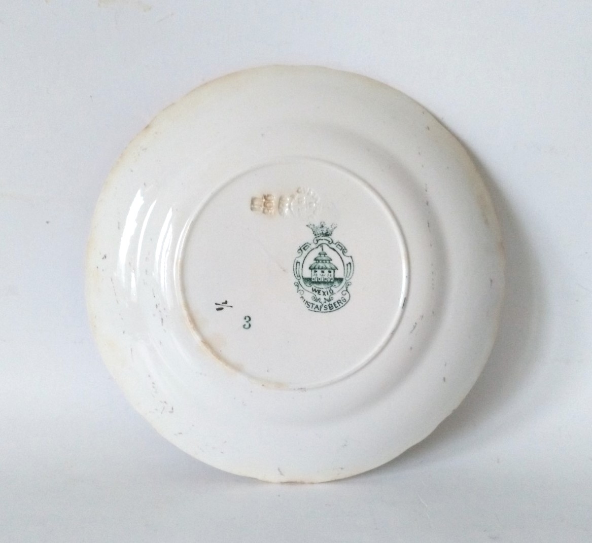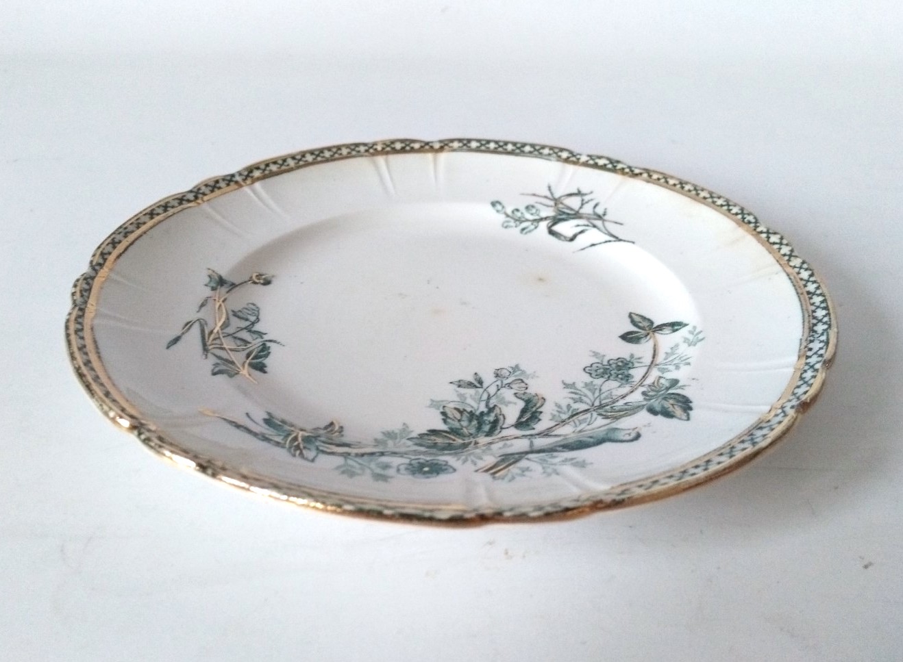 Klasyczny okrągły fason z ozdobnym rantem. Dekoracje naniesione metodą transferu, w barwie ciemnej zieleni, przedstawiają sylwetkę ptaka i motywy floralne. Rant i detal podkreślony szykownym złoceniem.