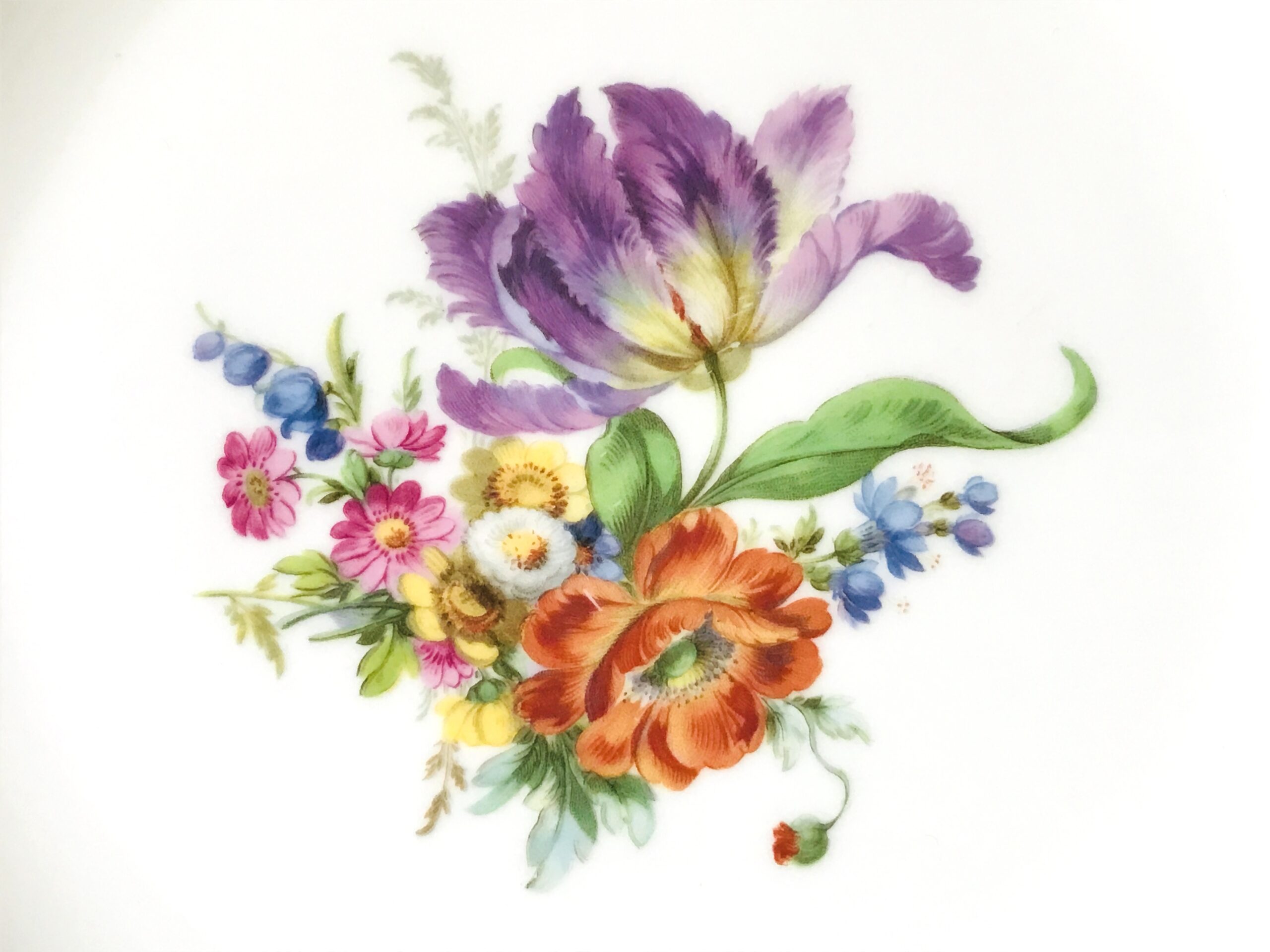 Nie mniej efektowna niż forma talerza jest jego kwiatowa dekoracja – mamy tu do czynienia z cudną kompozycją, której punktem fokalnym jest rozwinięta główka fioletowego tulipana i cynobrowego maku w towarzystwie polnych kwiatków na tle delikatnych zielonych listeczków. Całość prezentuje się zachwycająco.