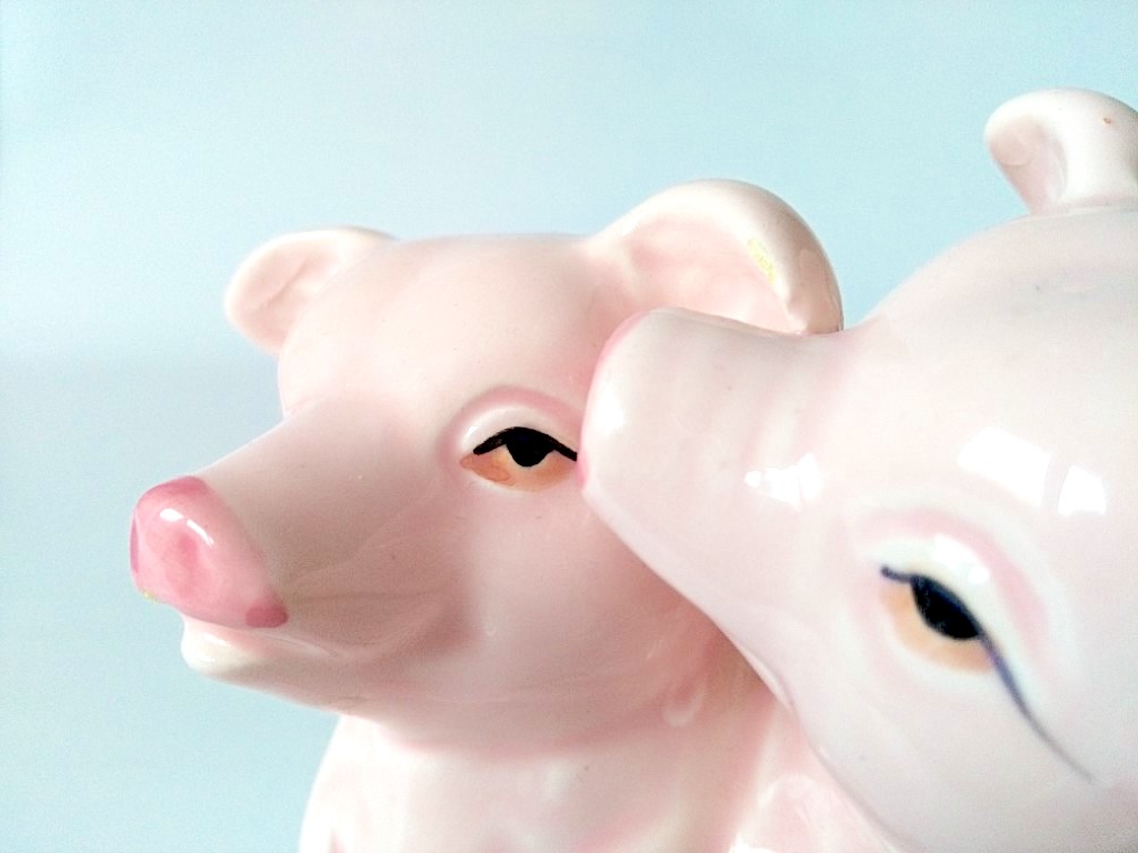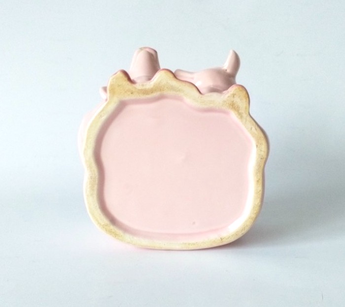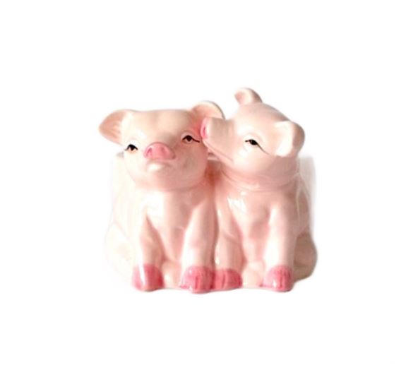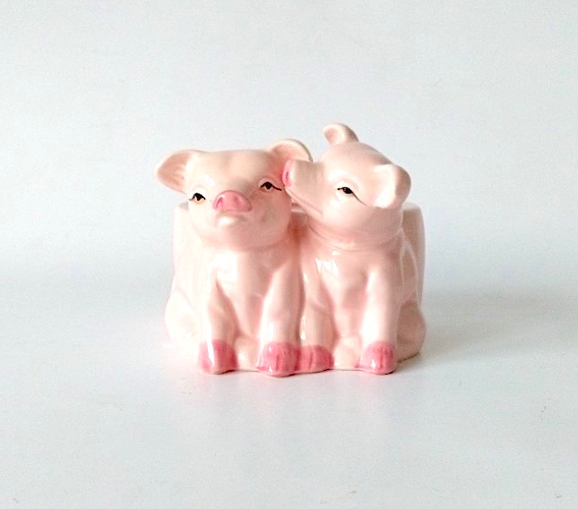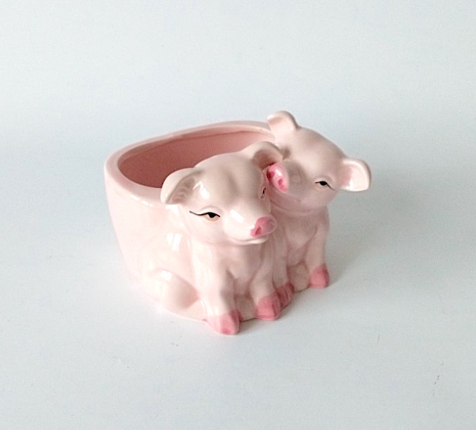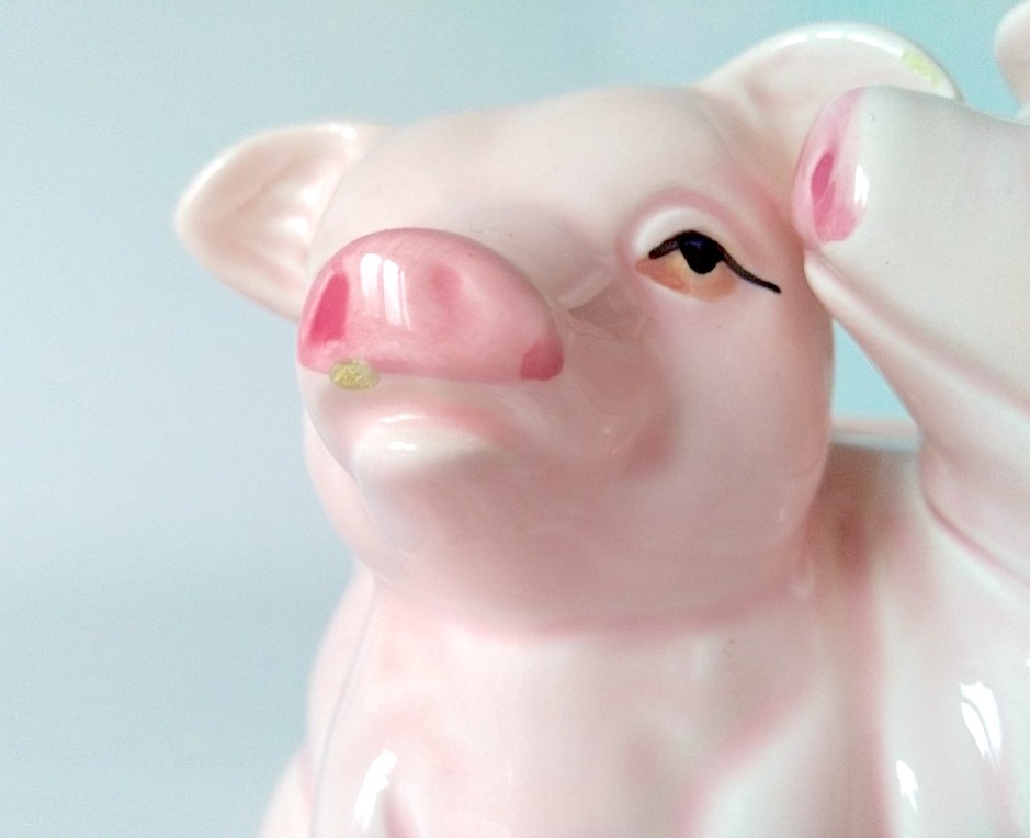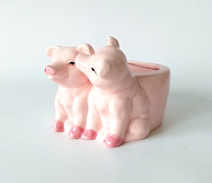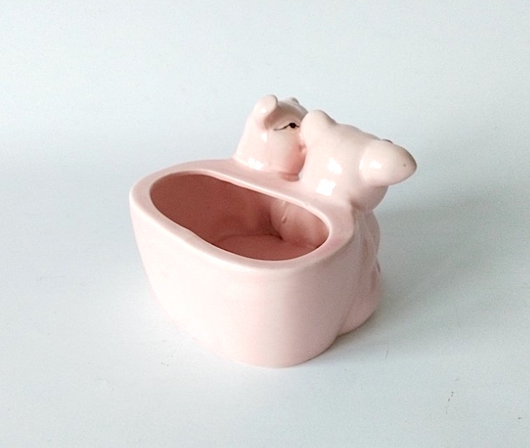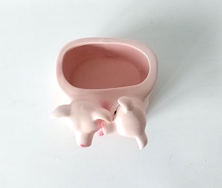 Główną dekorację stanowi urocza, zabawna para świnek, uwieczniona w przyjacielskim geście – jedna świnka wydaje się „chrumkać” drugiej sekret do ucha. To figuralne przedstawienie dodaje obiektowi wyjątkowego, żartobliwego uroku. Obiekt zachowany w dobrym stanie; posiada niewielką niedoskonałość szkliwa widoczną na ryjku jednej ze świnek. Idealna jako osłonka na małe sukulenty lub jako oryginalna, komiczna ozdoba.